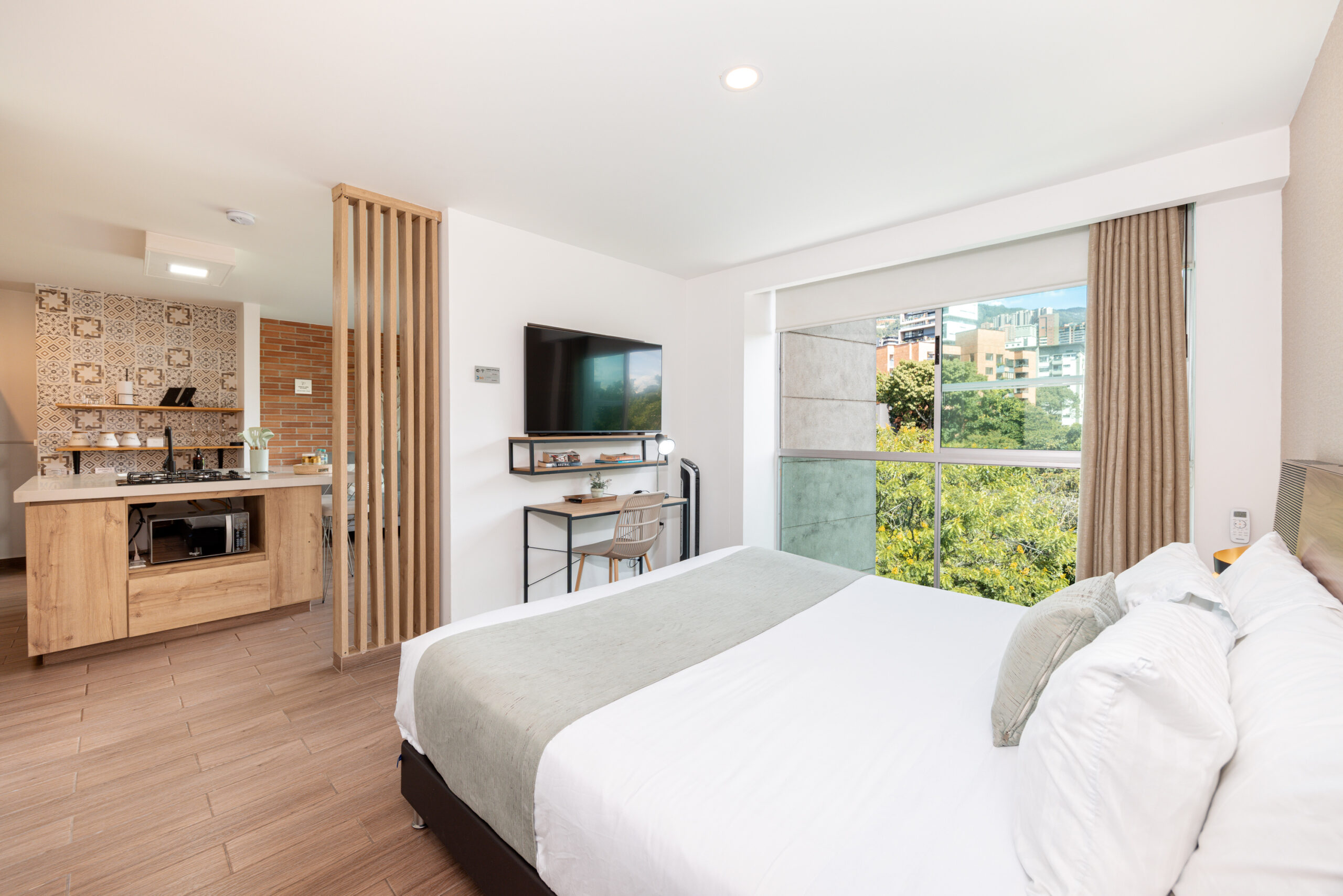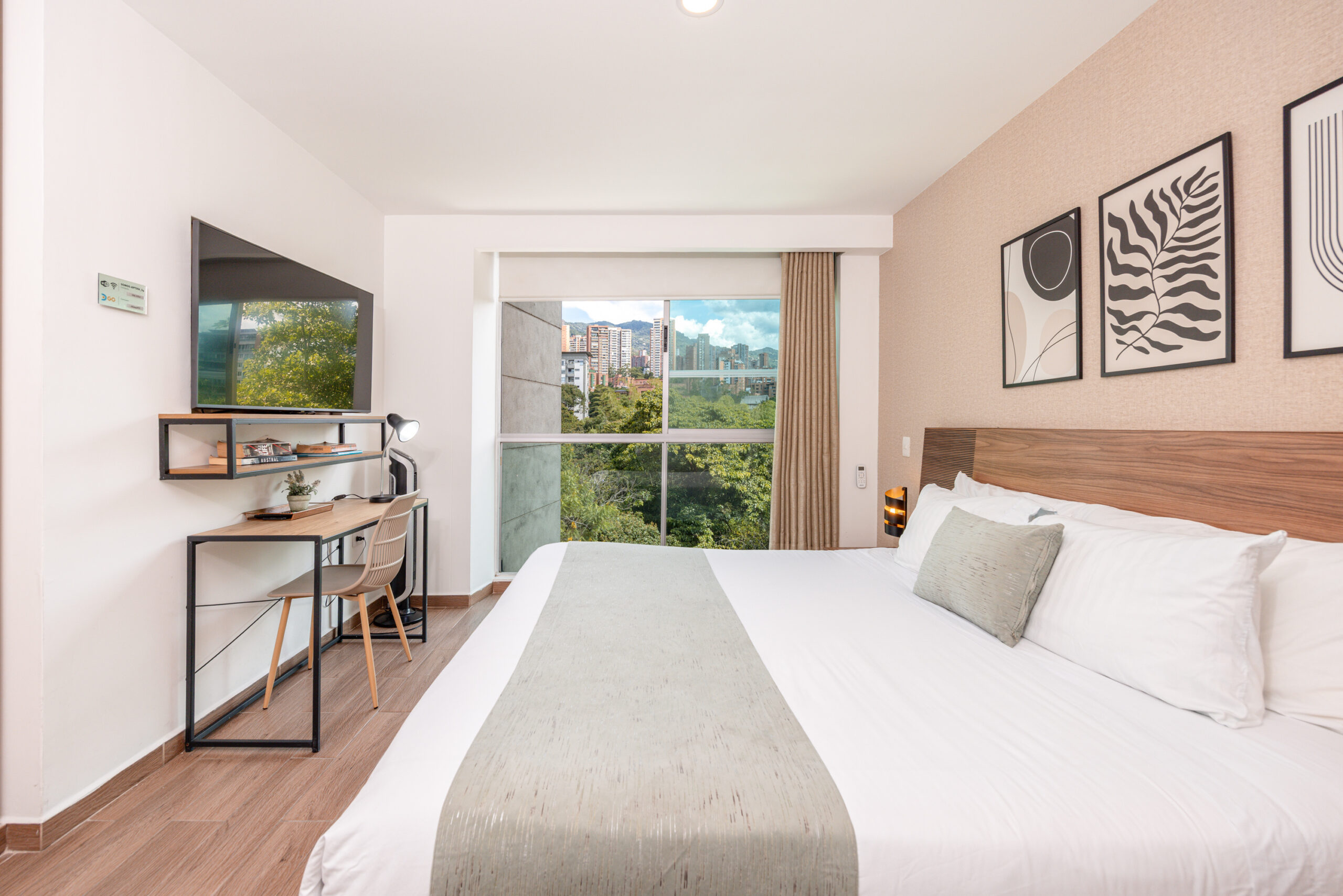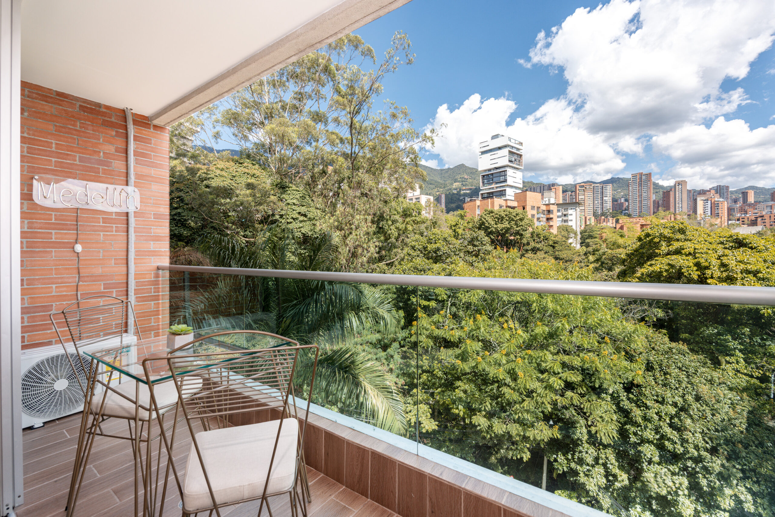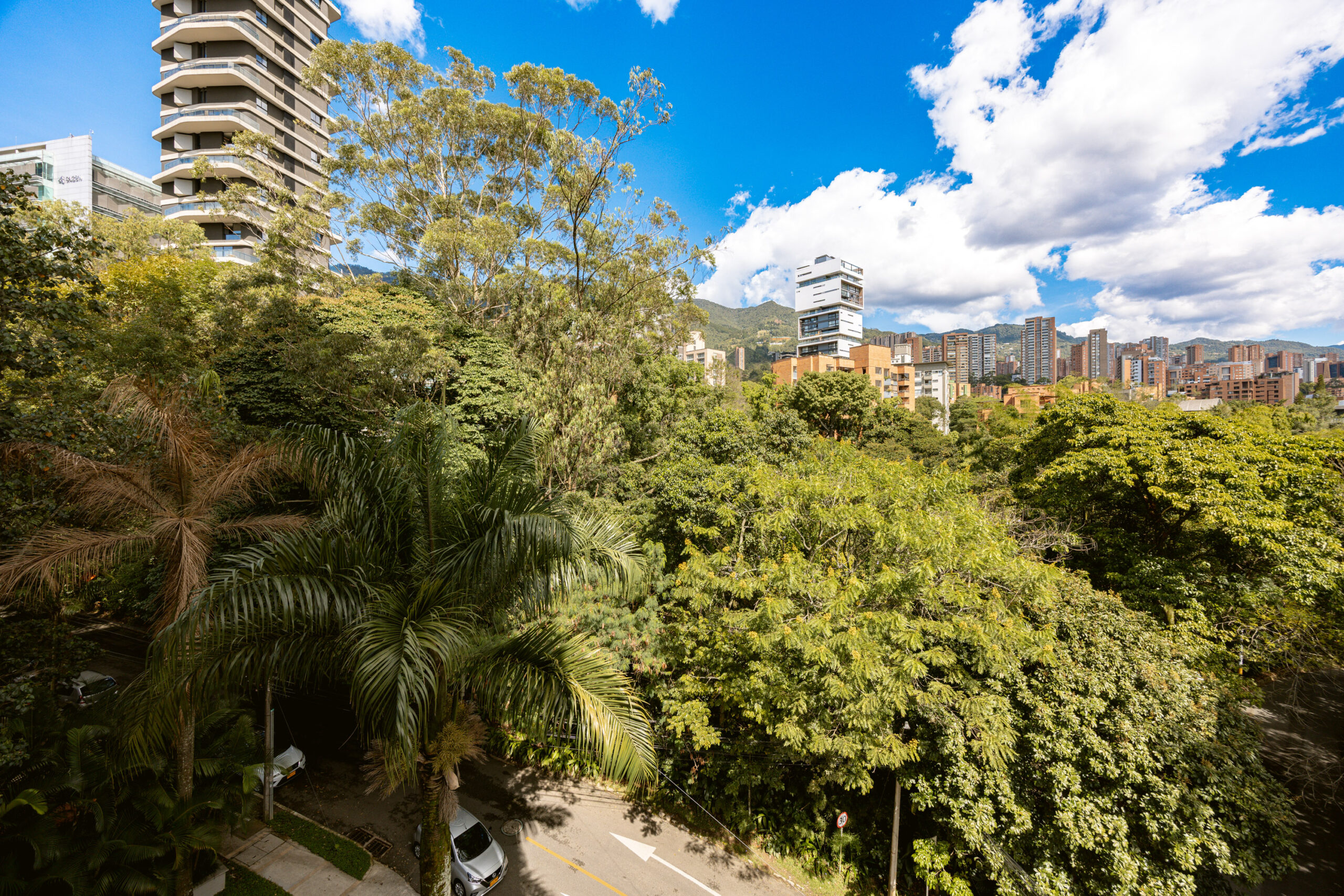 Enjoy Medellín in this peaceful studio with a balcony overlooking a green park. It features 1.5 bathrooms, a king-size bed, a desk with fast WiFi, A/C, a fully equipped kitchen, a washer/dryer, and a sofa bed for a third guest. The building offers 24/7 security, a pool, steam room, co-working space, terrace, and covered parking. Just 2 minutes from Interplaza Mall with restaurants and 10 minutes from Provenza and Lleras Park.