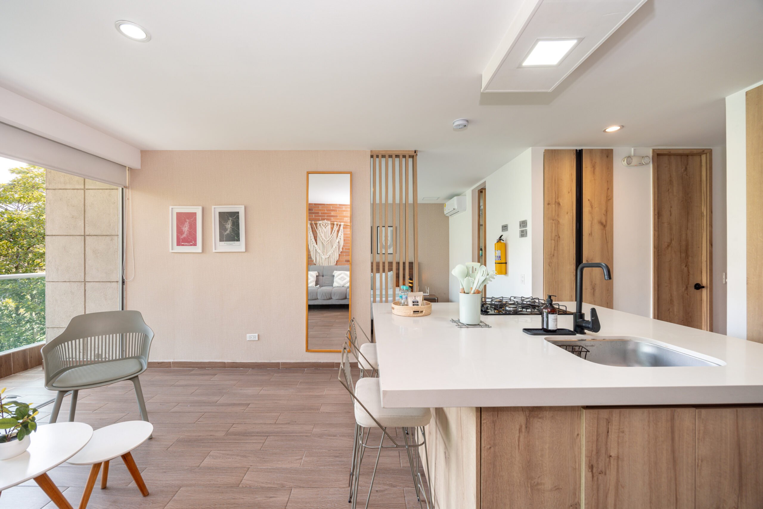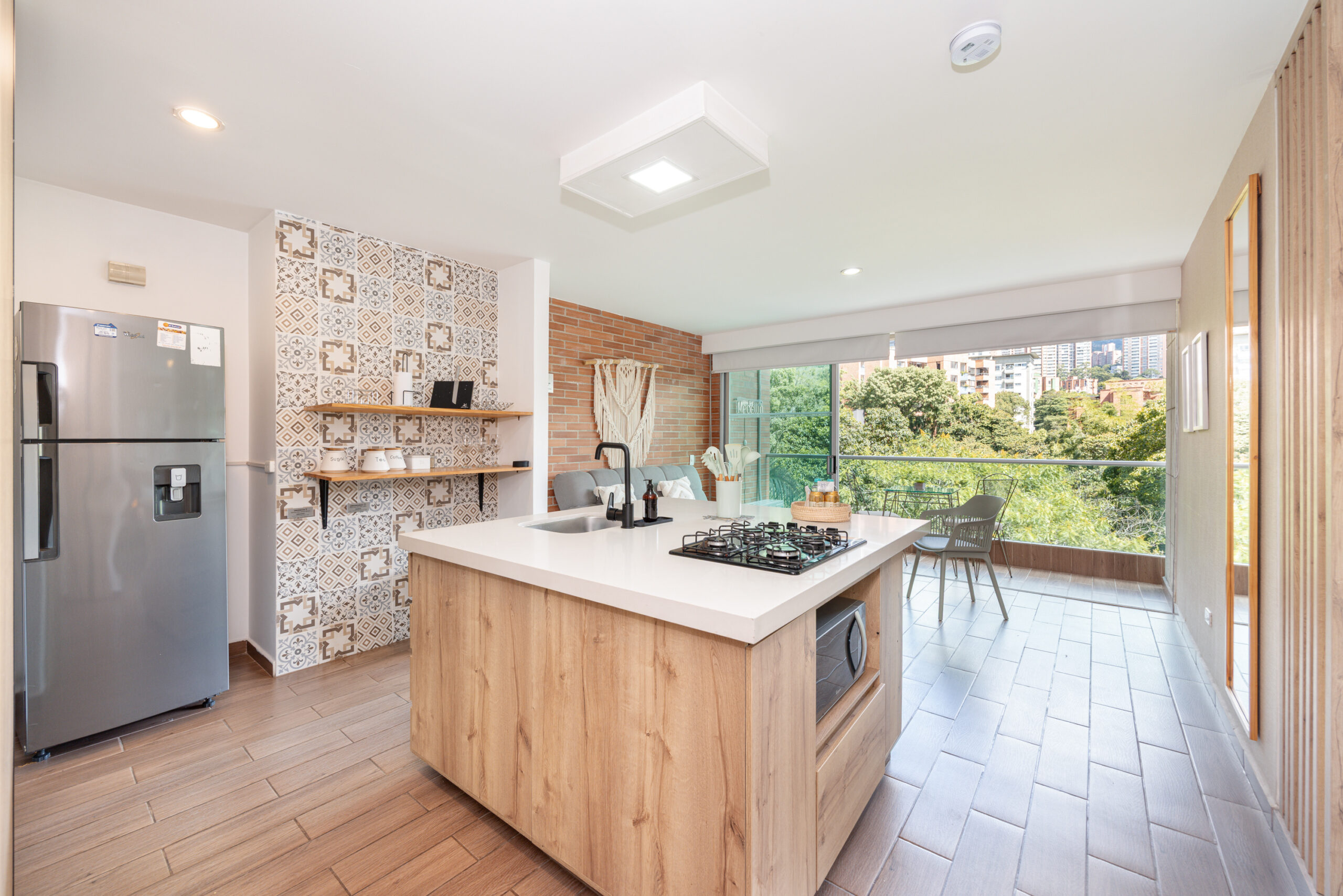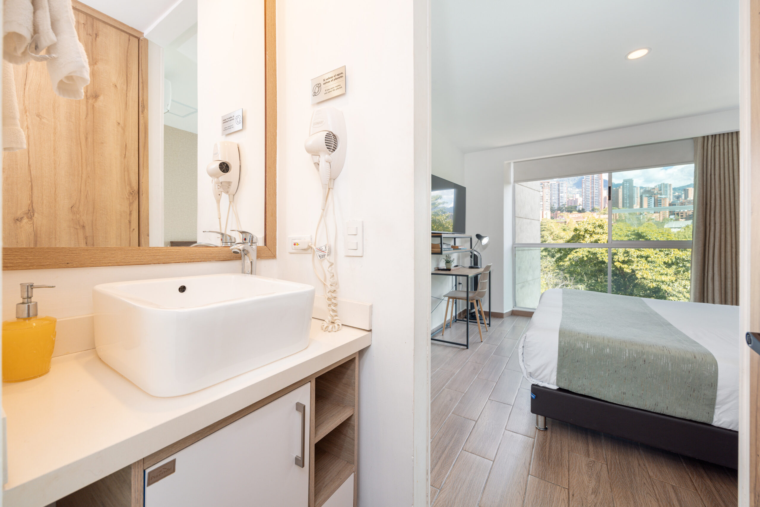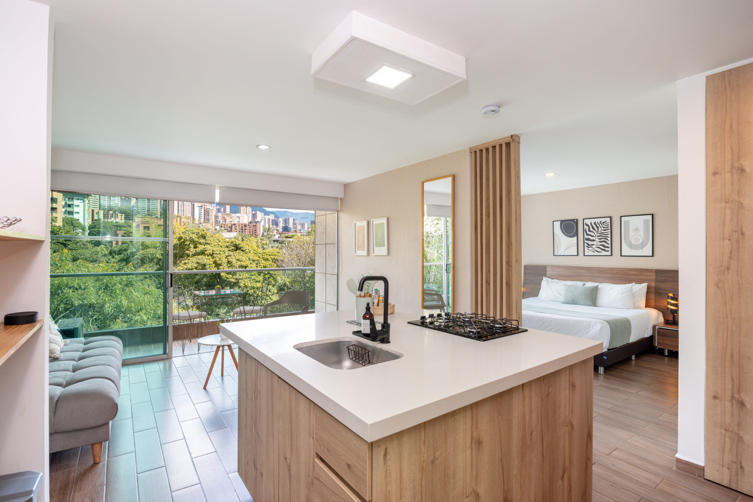 Enjoy Medellín in this peaceful studio with a balcony overlooking a green park. It features 1.5 bathrooms, a king-size bed, a desk with fast WiFi, A/C, a fully equipped kitchen, a washer/dryer, and a sofa bed for a third guest. The building offers 24/7 security, a pool, steam room, co-working space, terrace, and covered parking. Just 2 minutes from Interplaza Mall with restaurants and 10 minutes from Provenza and Lleras Park.