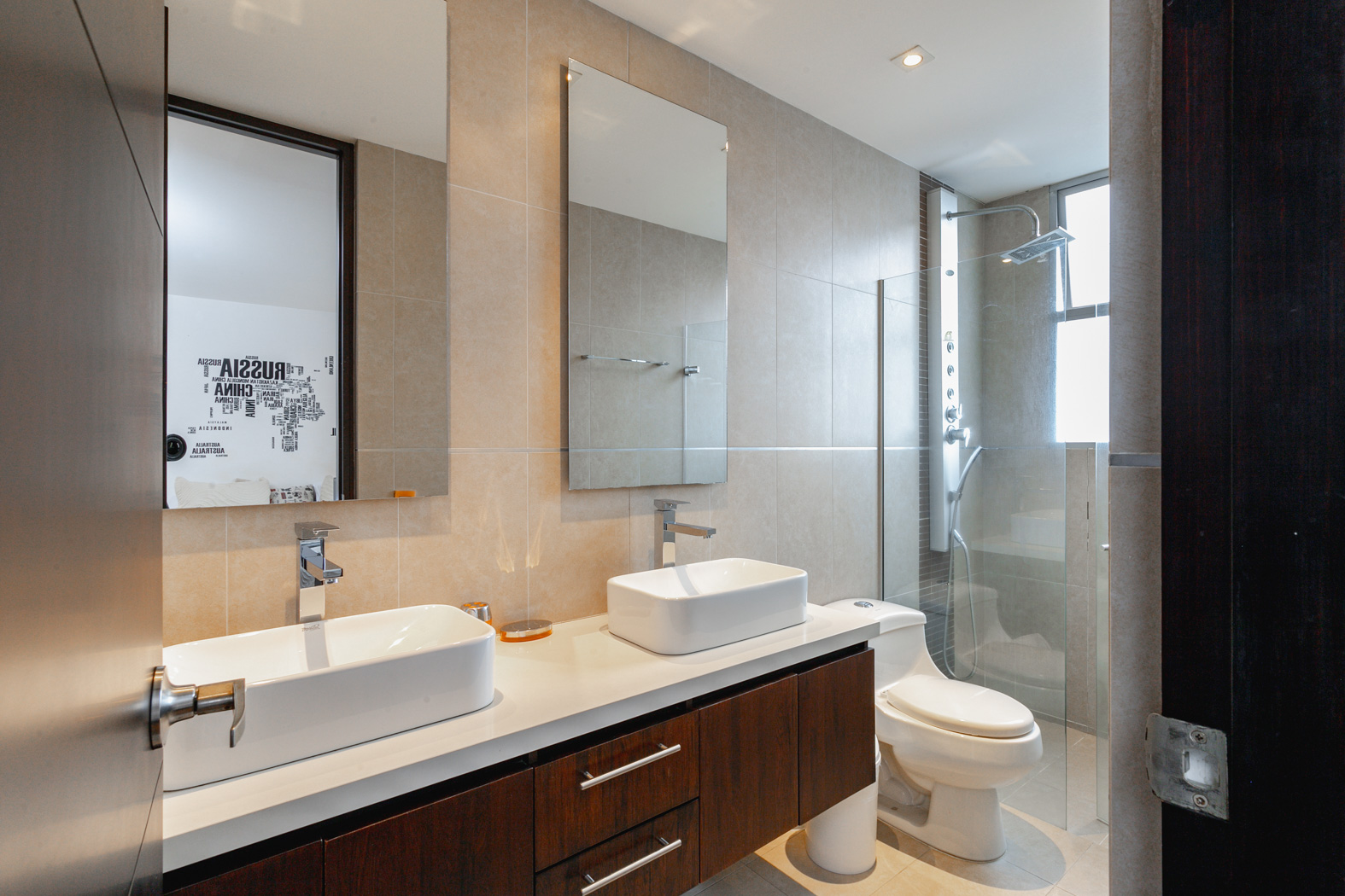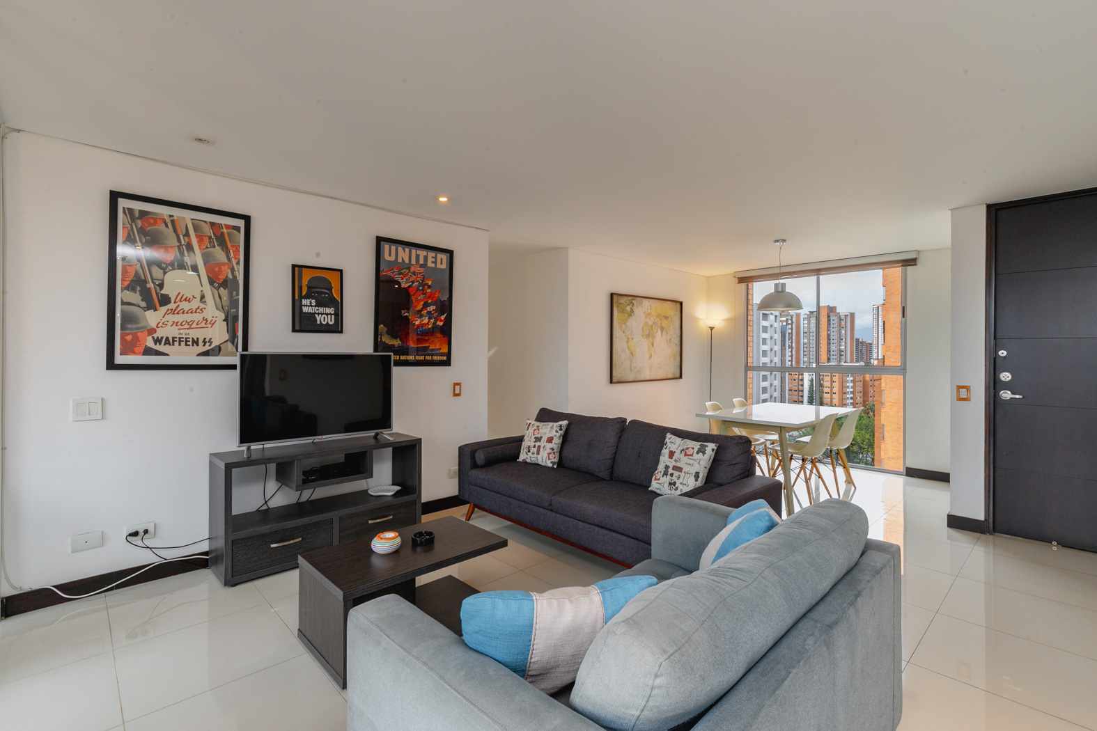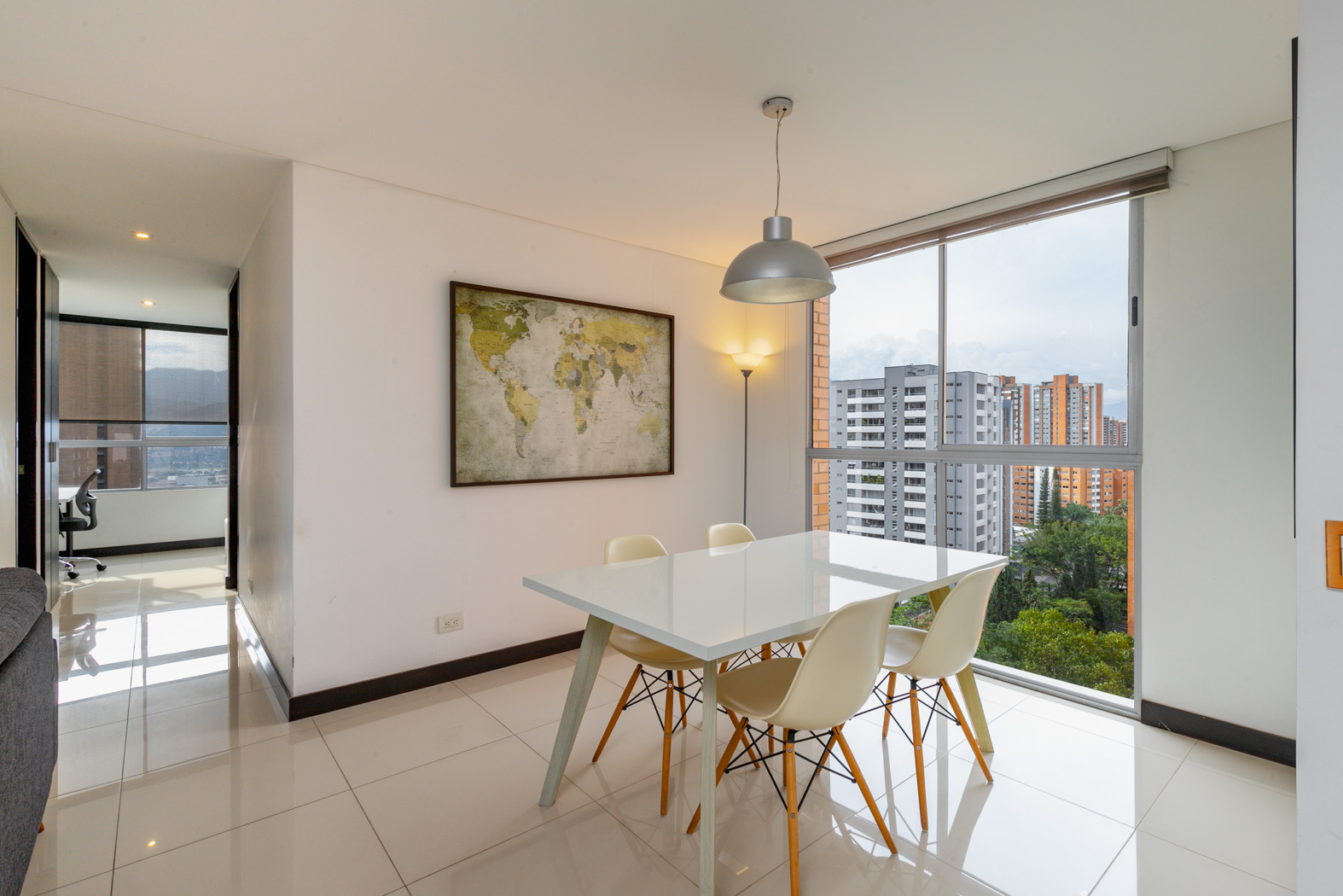 Enjoy the best Medellin has to offer in this bright and spacious two-bedroom apartment. Best described as comfortable minimalism, this home-away-from-home has everything you need for a relaxing stay. The fully-equipped kitchen features modern appliances including a dishwasher for added convenience. The dining area comfortably seats four and a quaint balcony table provides room for two more guests. In the master bedroom, a walk-in closet, flat-screen TV, and a plush king bed greet you after a busy day of work. An impressively modern ensuite adds some additional privacy. The guest bedroom boasts an ensuite bathroom.