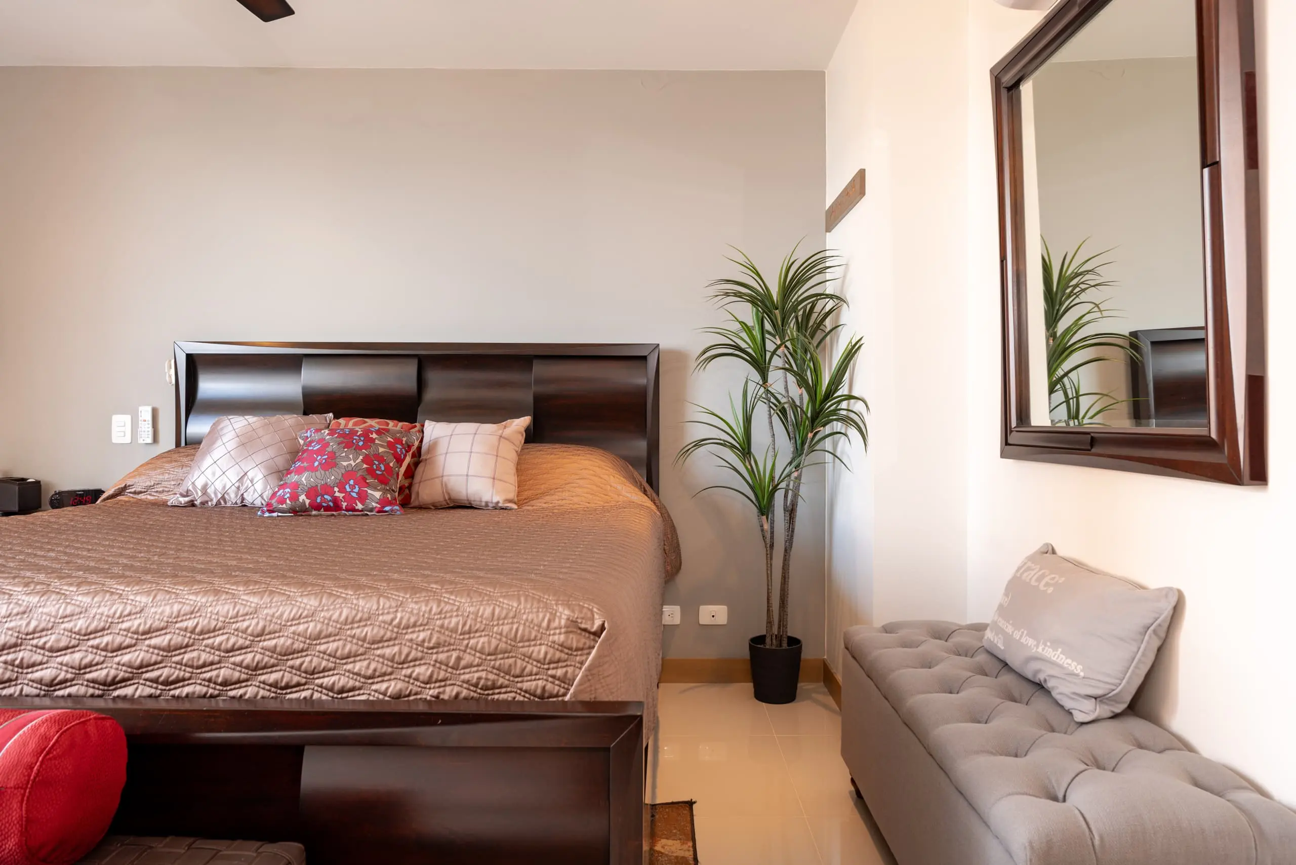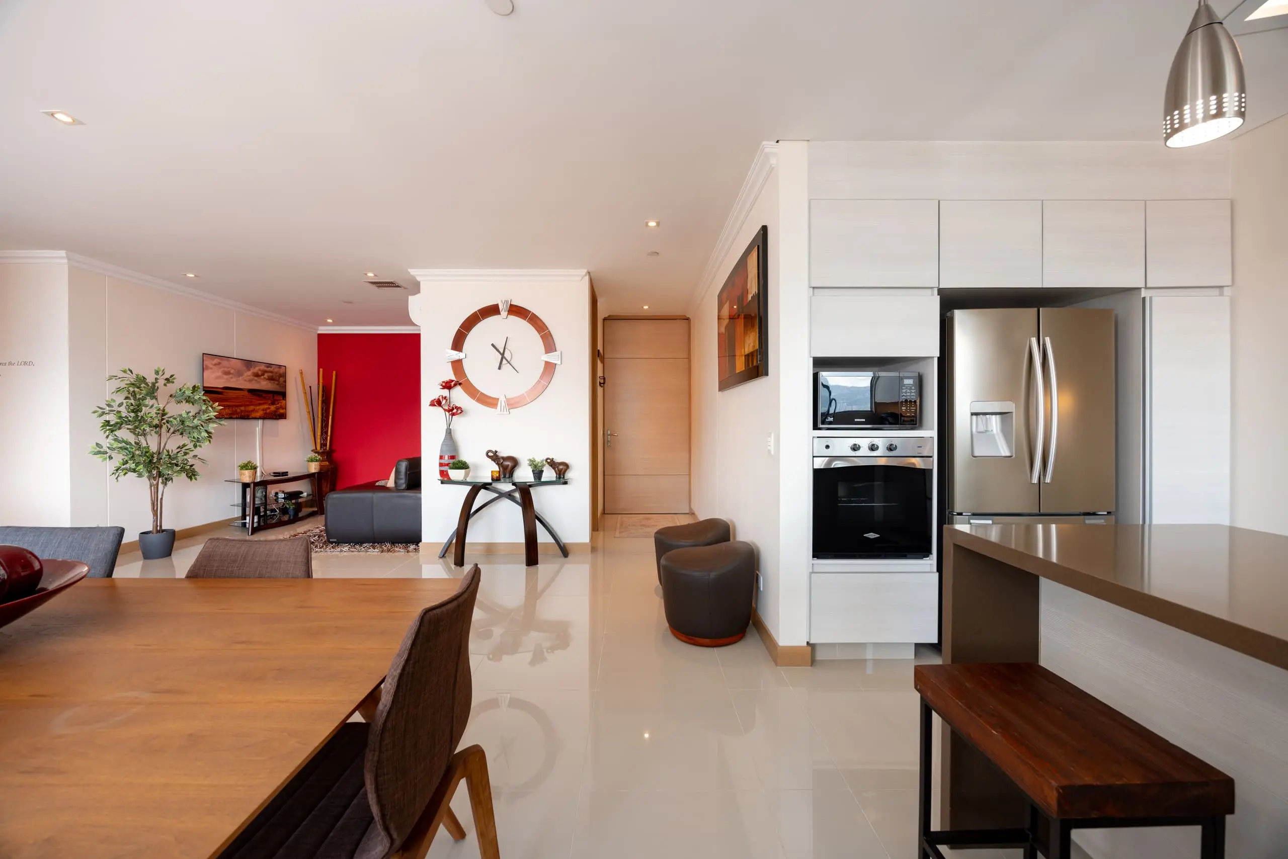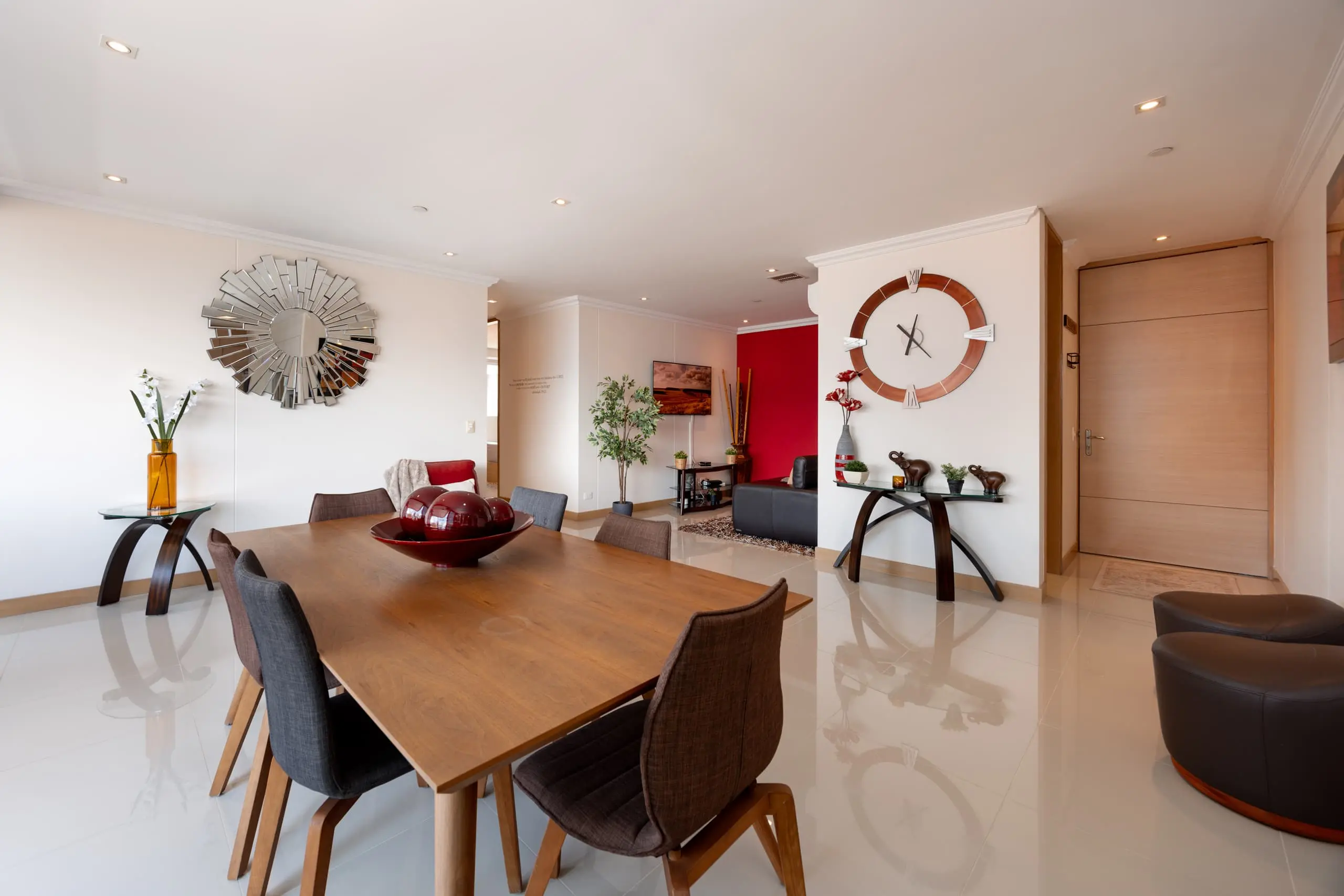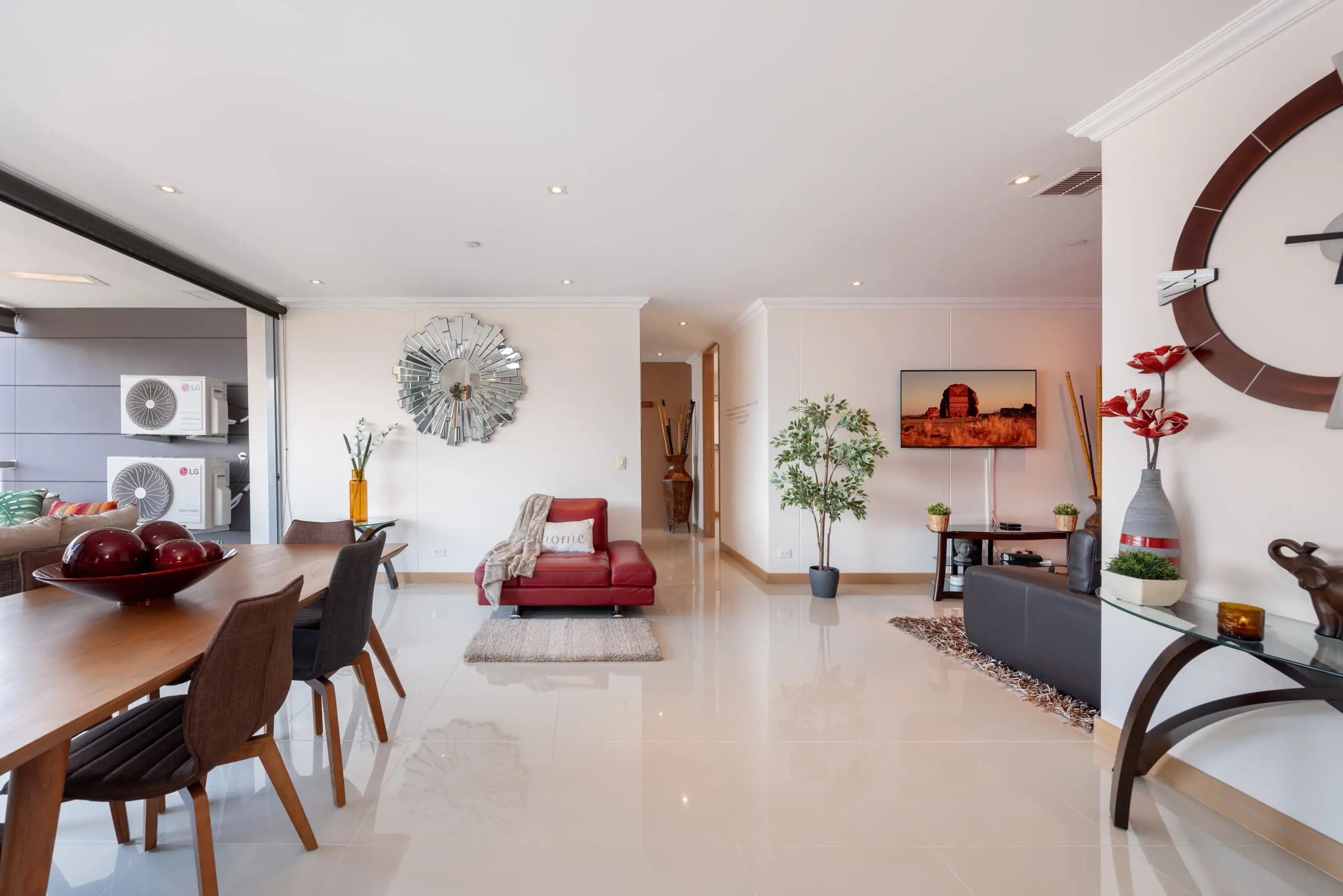 This luxurious 3-bdr apt offers comfort with private bathrooms in each room. The masters includes a king bed, walk-in closet, and a double-sink bath. The spacious living room has a dining area for 6, a TV area, and a balcony w/ stunning views. It has a fully equipped kitchen, dishwasher, and laundry area with another room. Located on the 17th floor, Atenas offers a pool, gym, steam room, squash court. 3 min to San Fernando Mall and 10 to Provenza. Ideal for families, digital nomads, and tourists