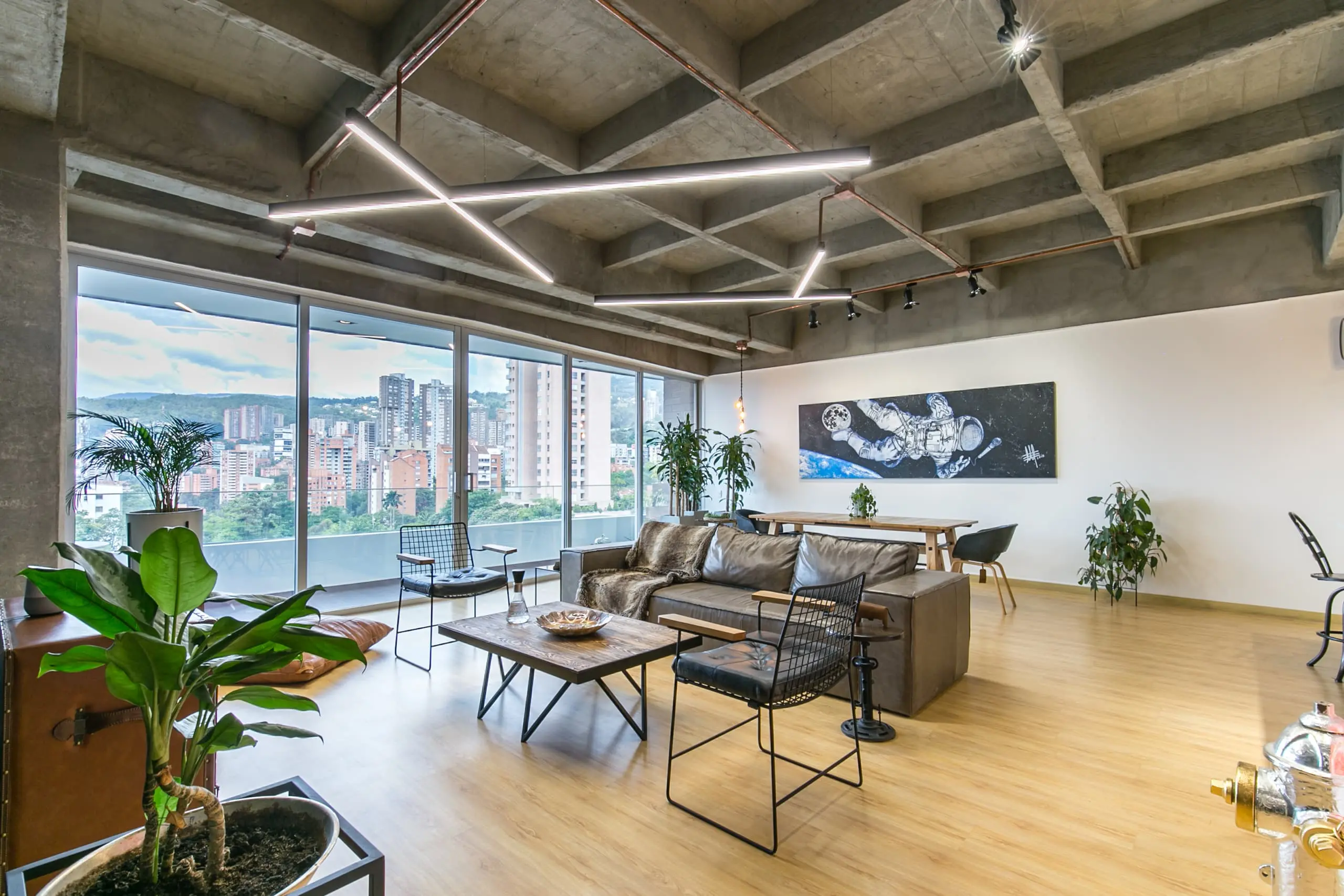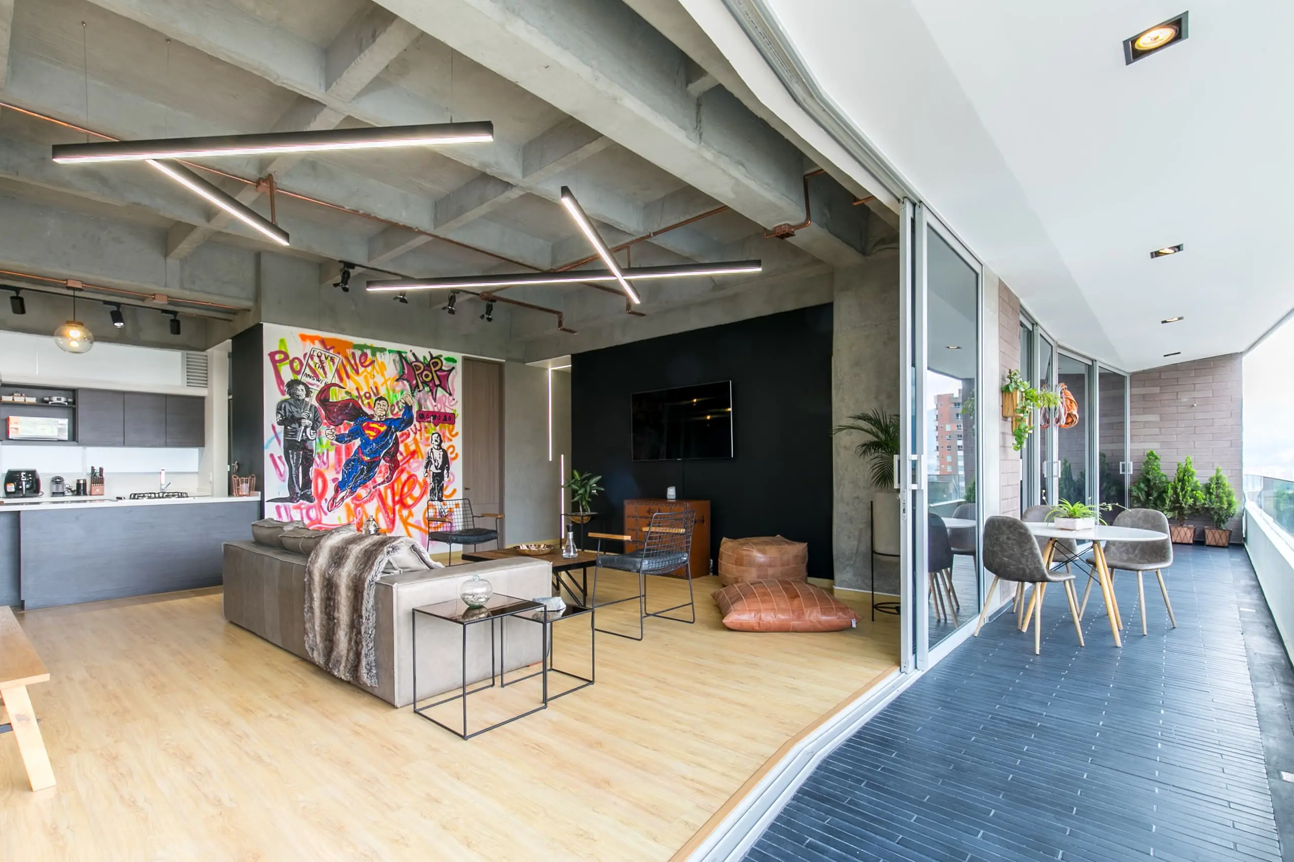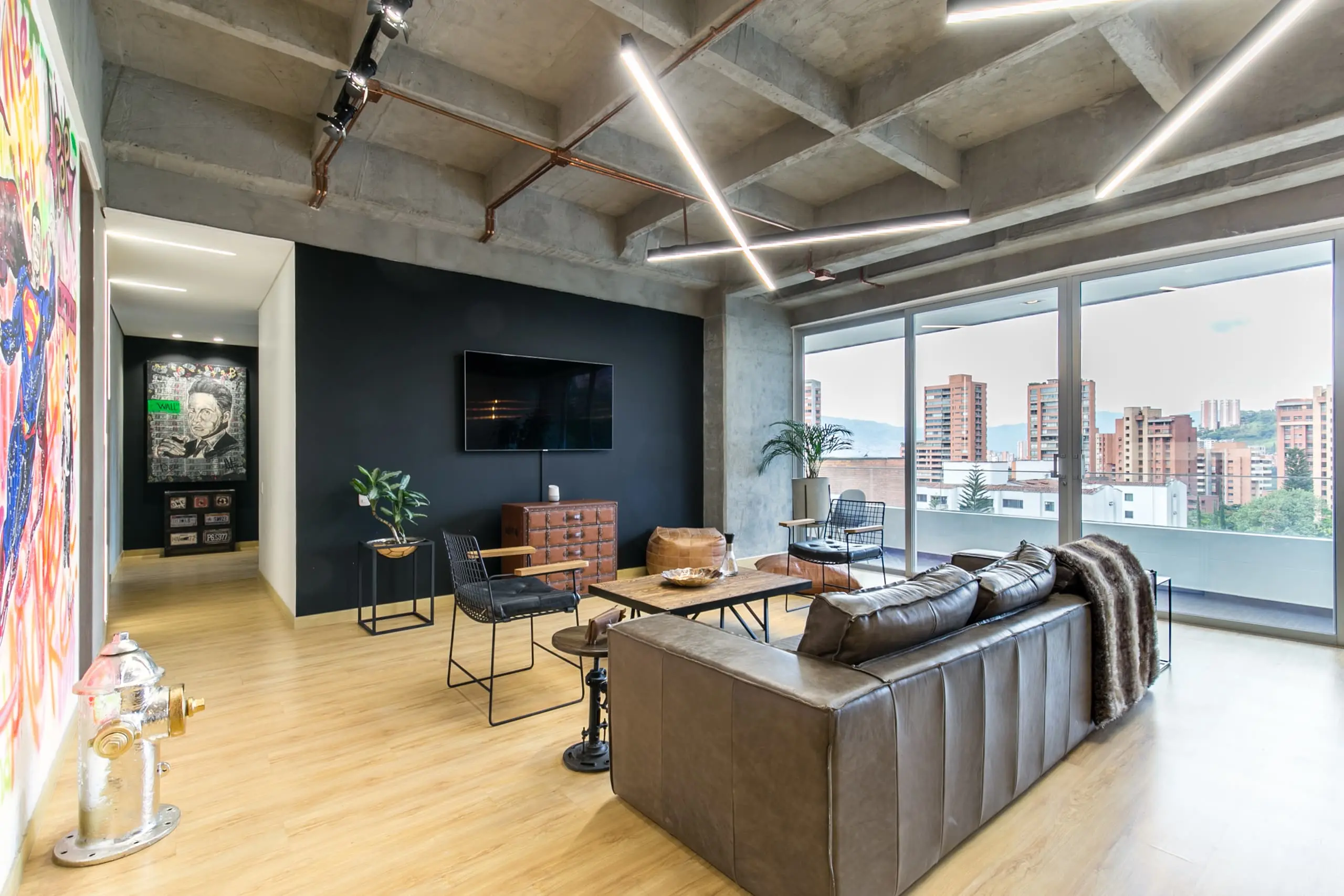 The first space features a wide and bright living room with high ceiling, modern furniture with leather upholstery, unique local art pieces, open and fully equipped kitchen, a practical laundry area, a guest bathroom, and a large balcony with sun and soundproofed doors and beautiful views over the north of Medellin.