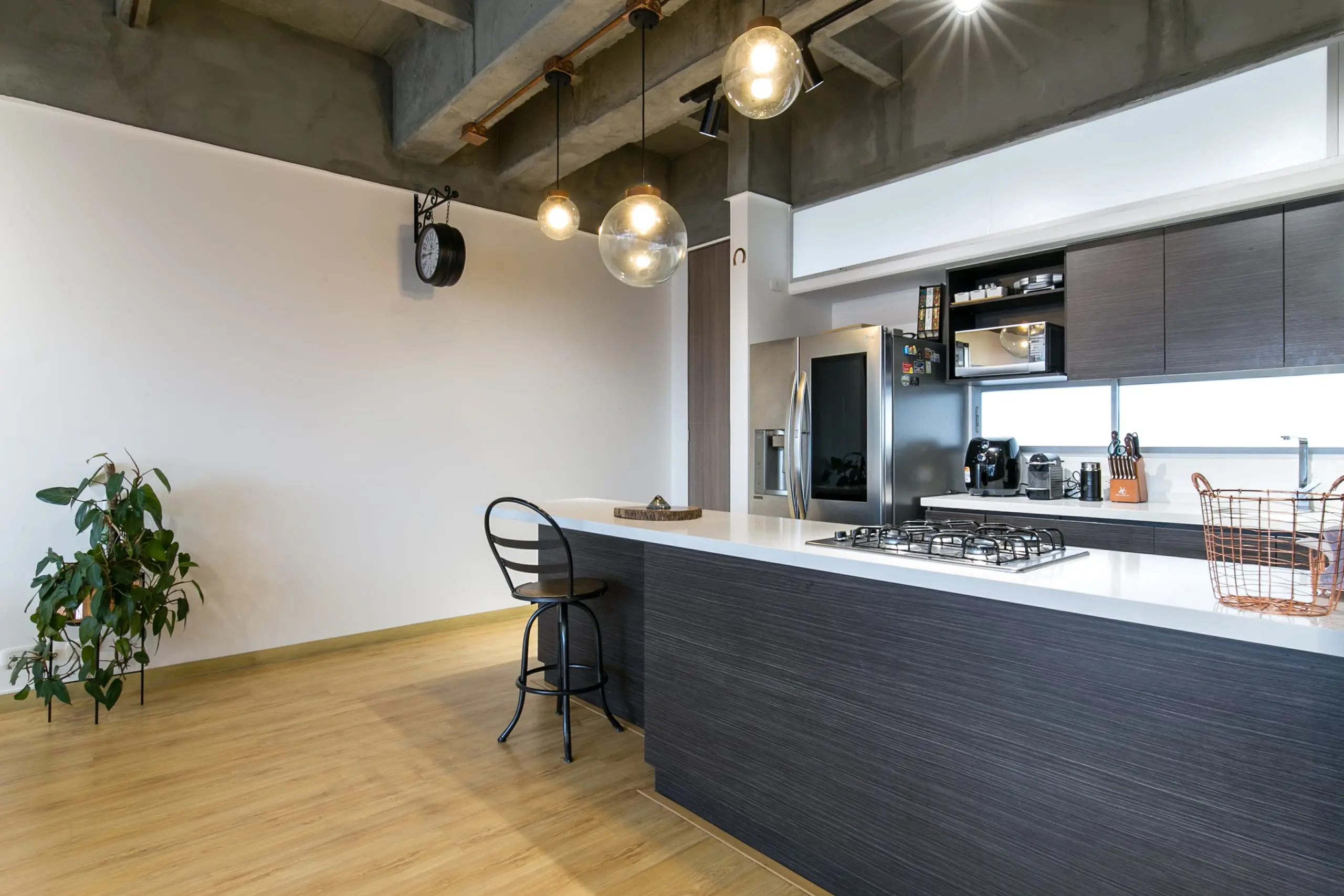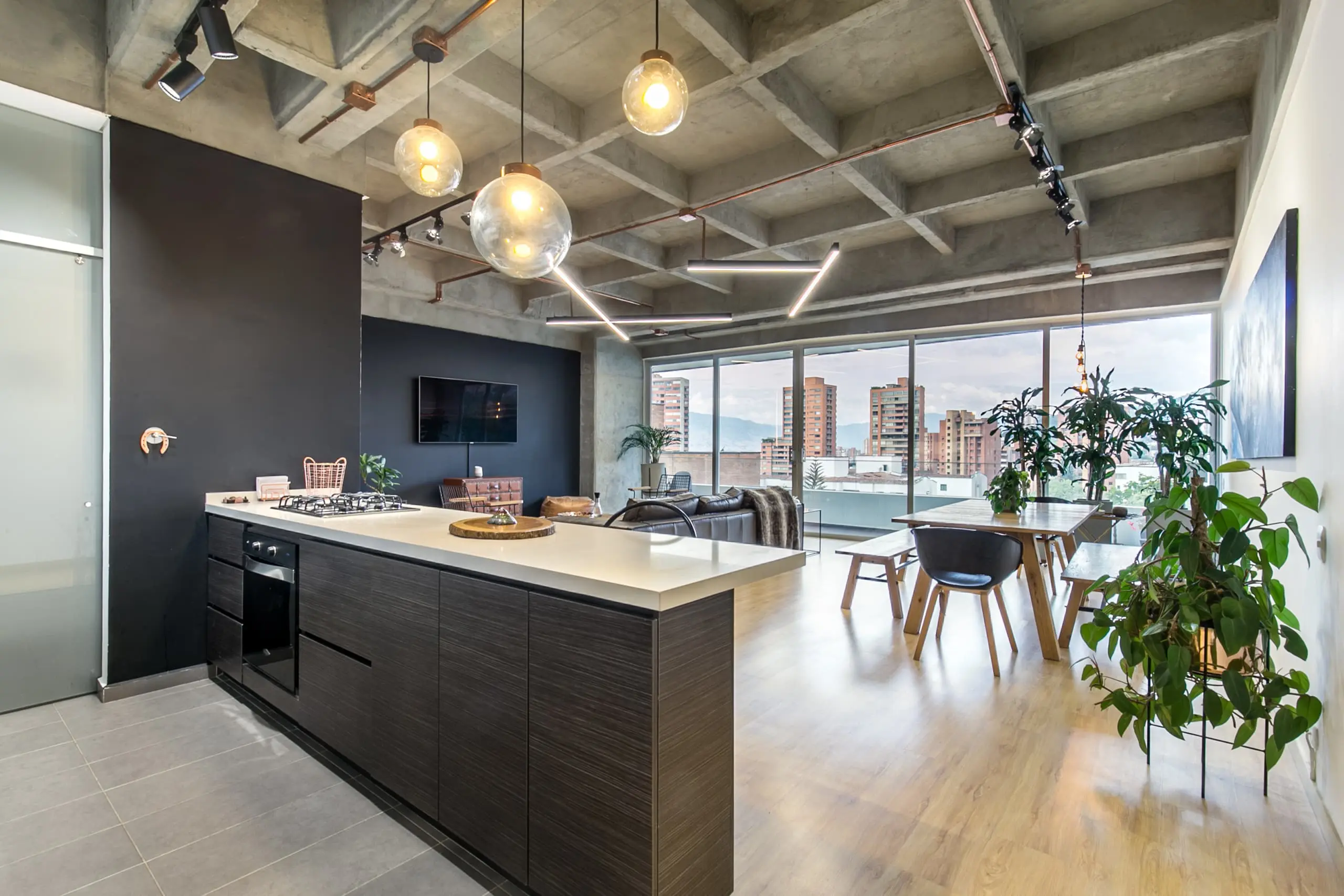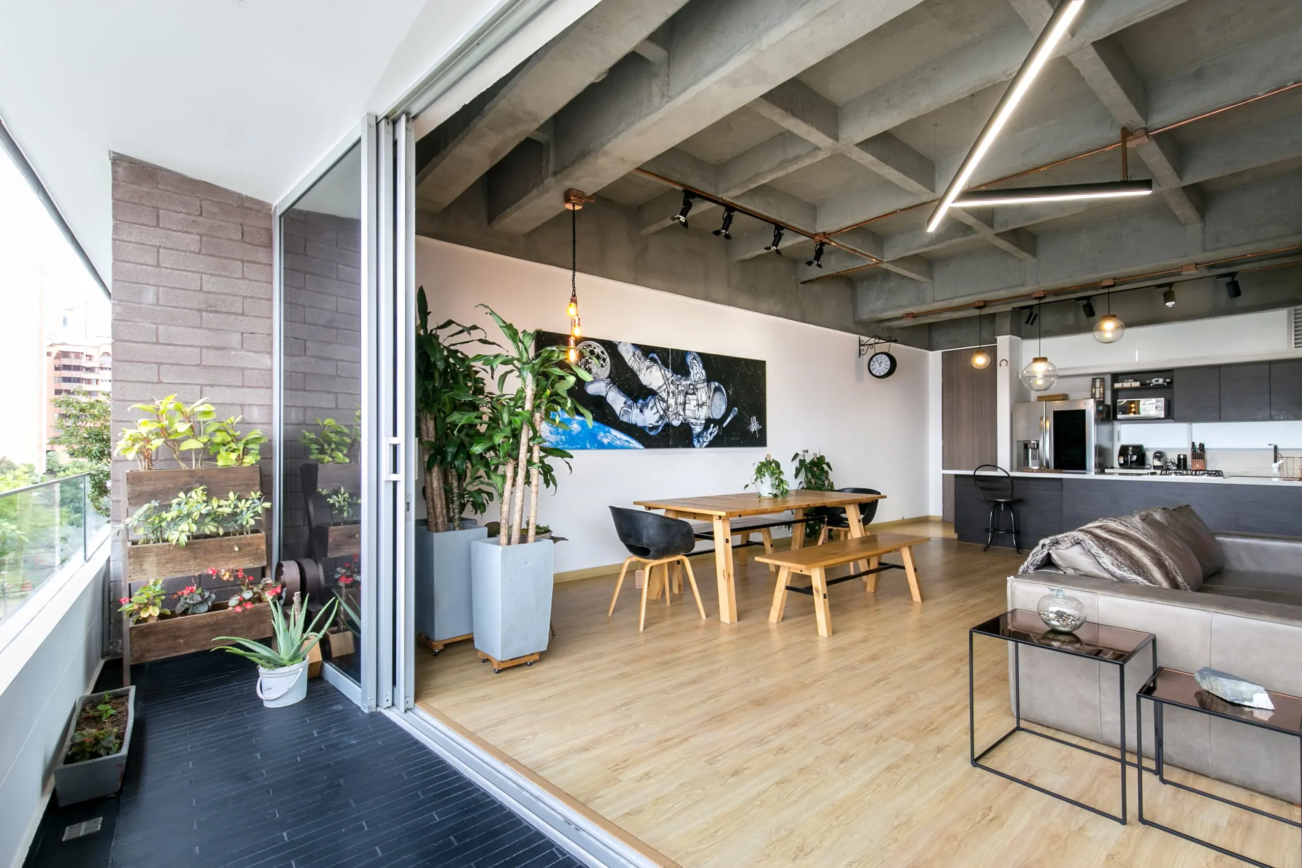 The first space features a wide and bright living room with high ceiling, modern furniture with leather upholstery, unique local art pieces, open and fully equipped kitchen, a practical laundry area, a guest bathroom, and a large balcony with sun and soundproofed doors and beautiful views over the north of Medellin.