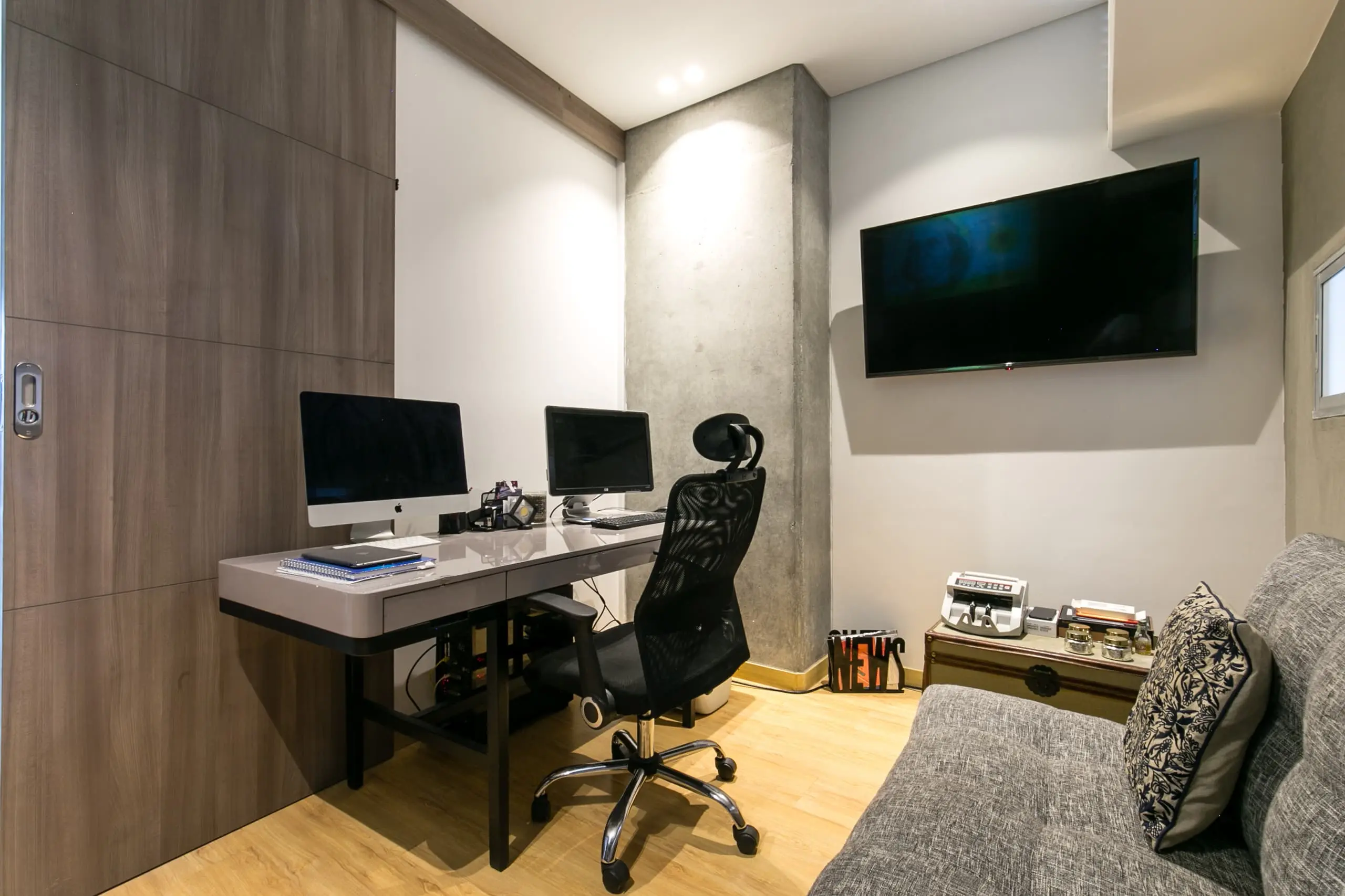 The second bedroom features a queen-size bed, black-out curtains, a large closet, and access to the balcony. Just in front, you will find a private studio with a functional desk and a comfortable sofa to relax while working from home.
