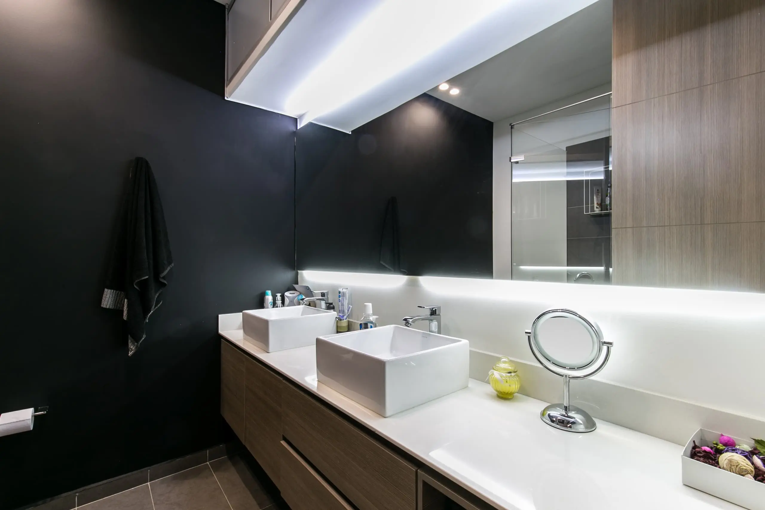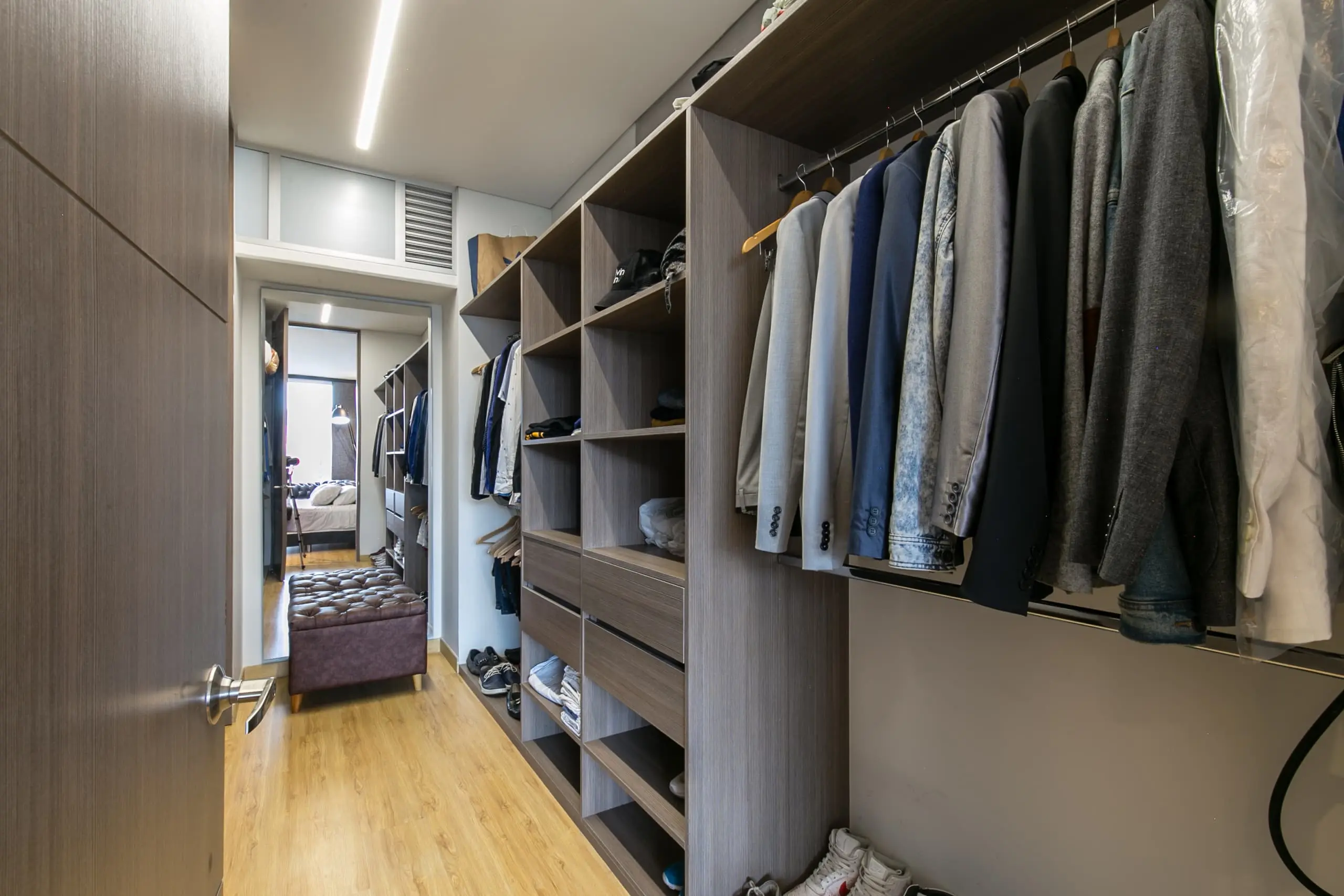 The master bedroom features a king-sized bed, black-out curtains, spacious walk-in closet, private bathroom with shower, two sinks and a wonderful mirror with great illumination, a smart TV and a wide window to the city with access to the balcony that crosses the entire apartment.