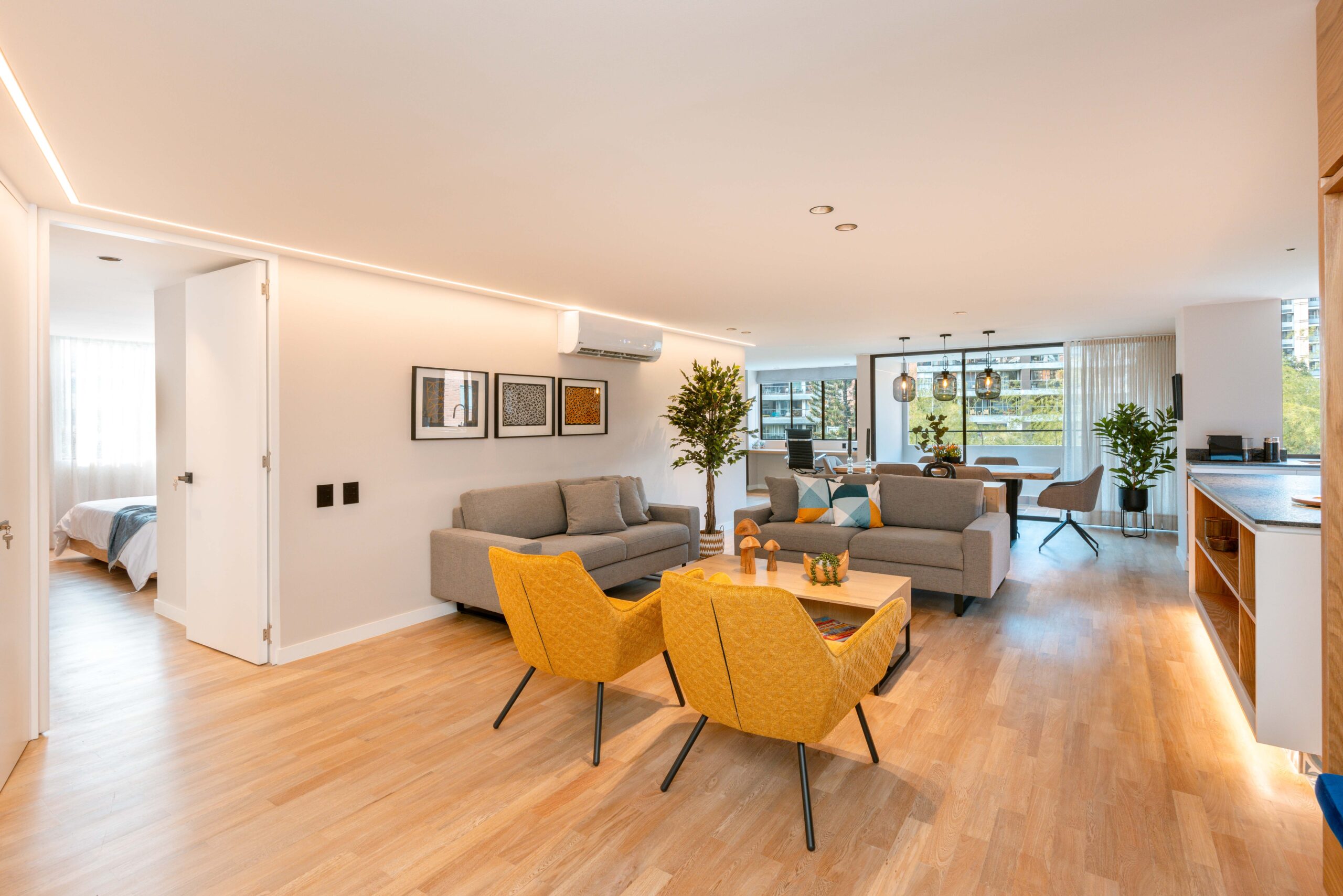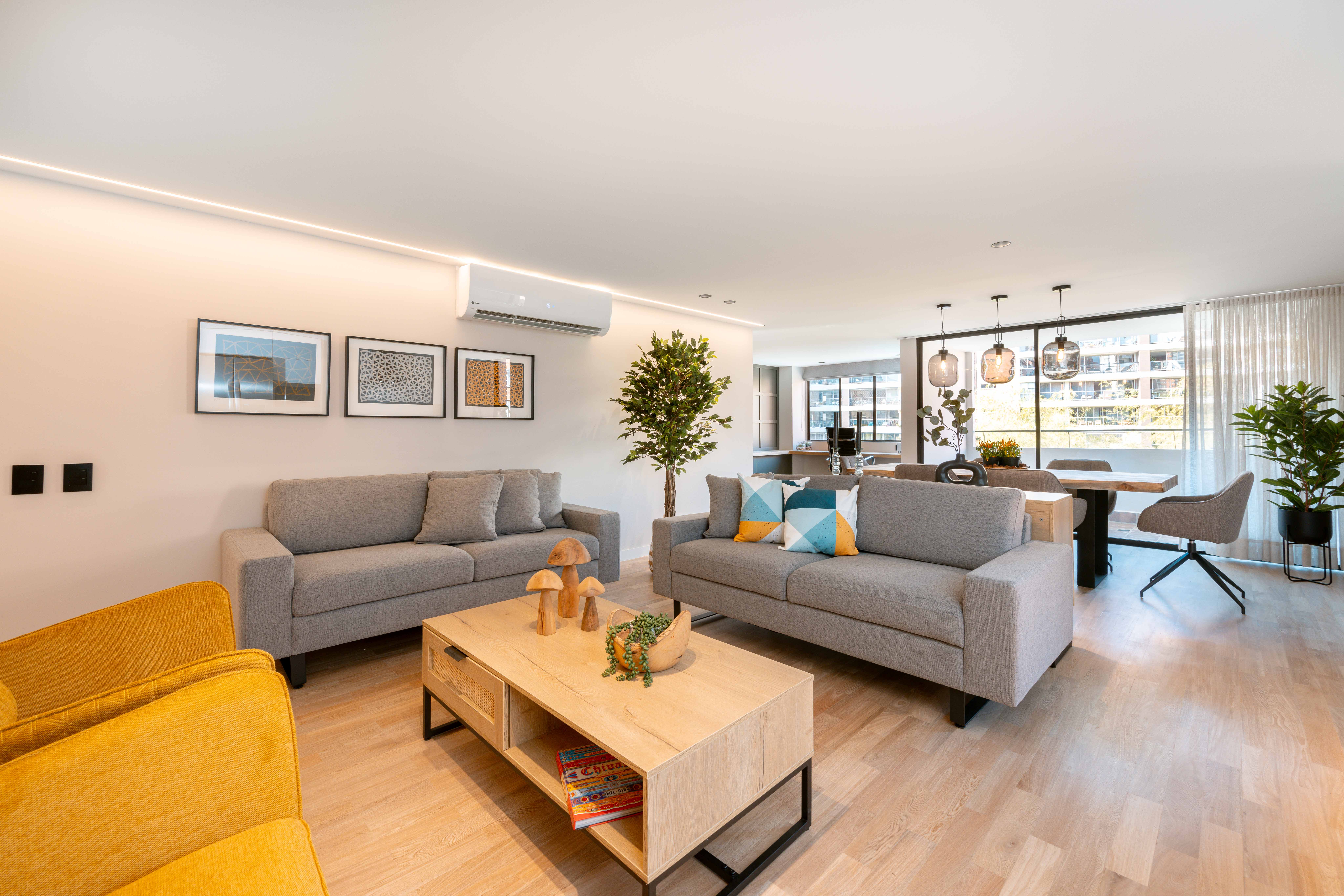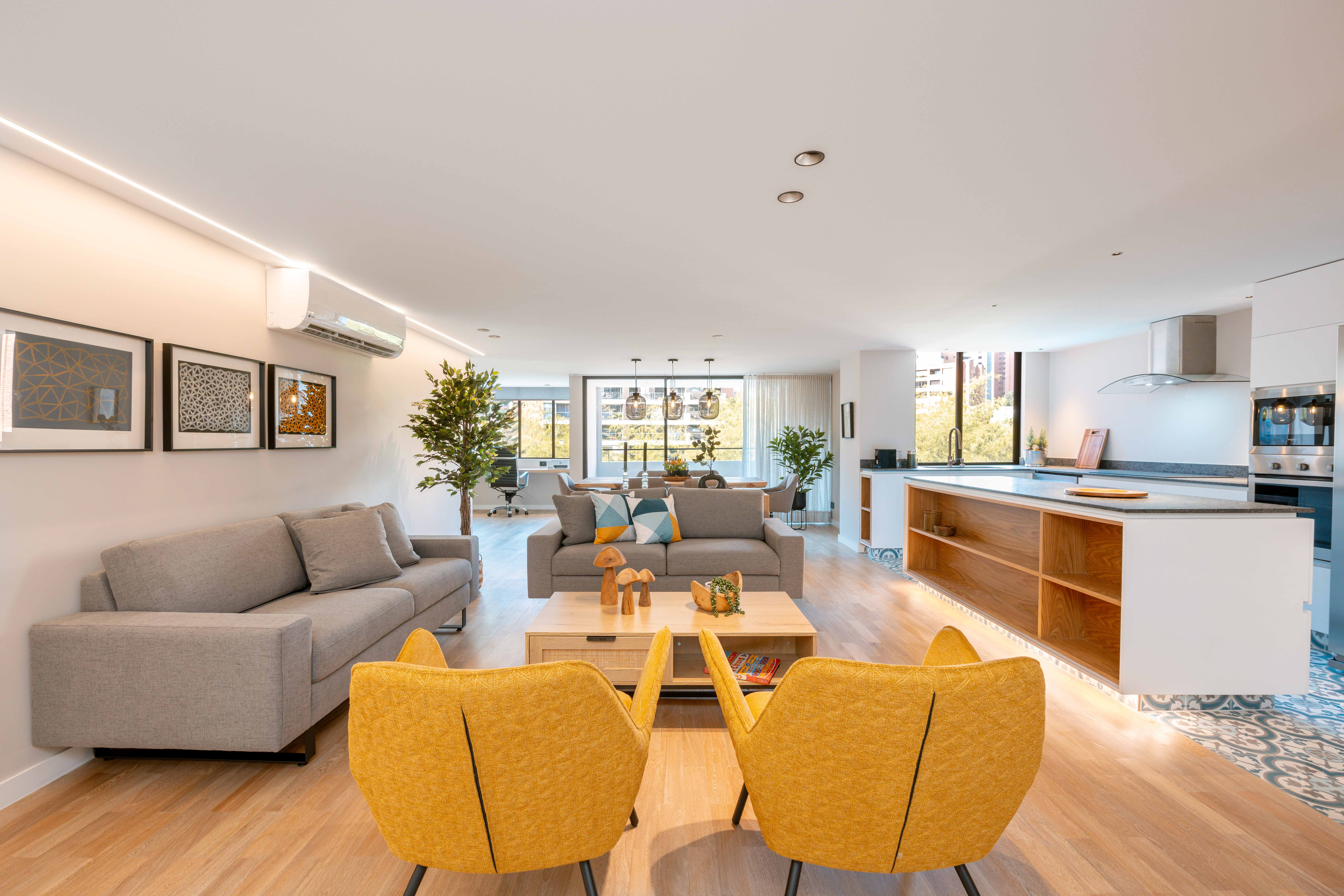 This brand-new and family-friendly 2-bedroom apartment features private bathrooms, closets, and AC in each room. The open living area includes a spacious living room, dining area, studio, and balcony with outdoor furniture perfect for relaxation. The fully equipped kitchen offers all essentials, including a dishwasher, while the laundry area has a washer, dryer, and custom cabinets.