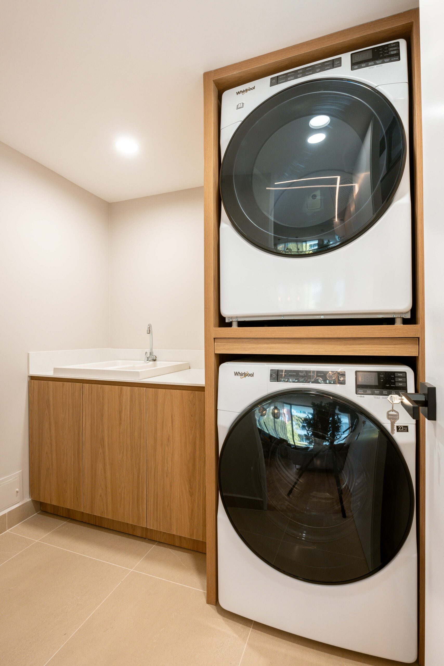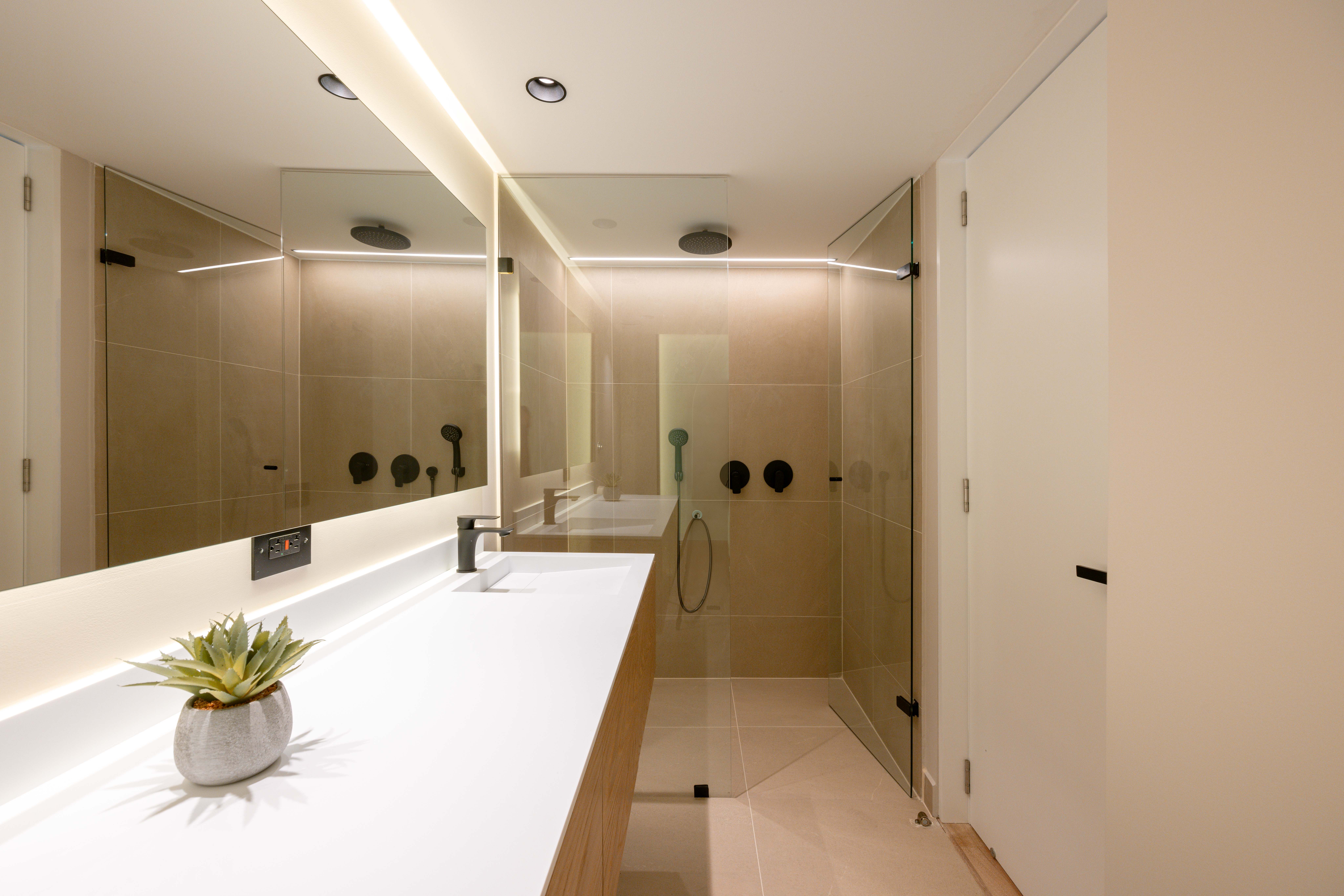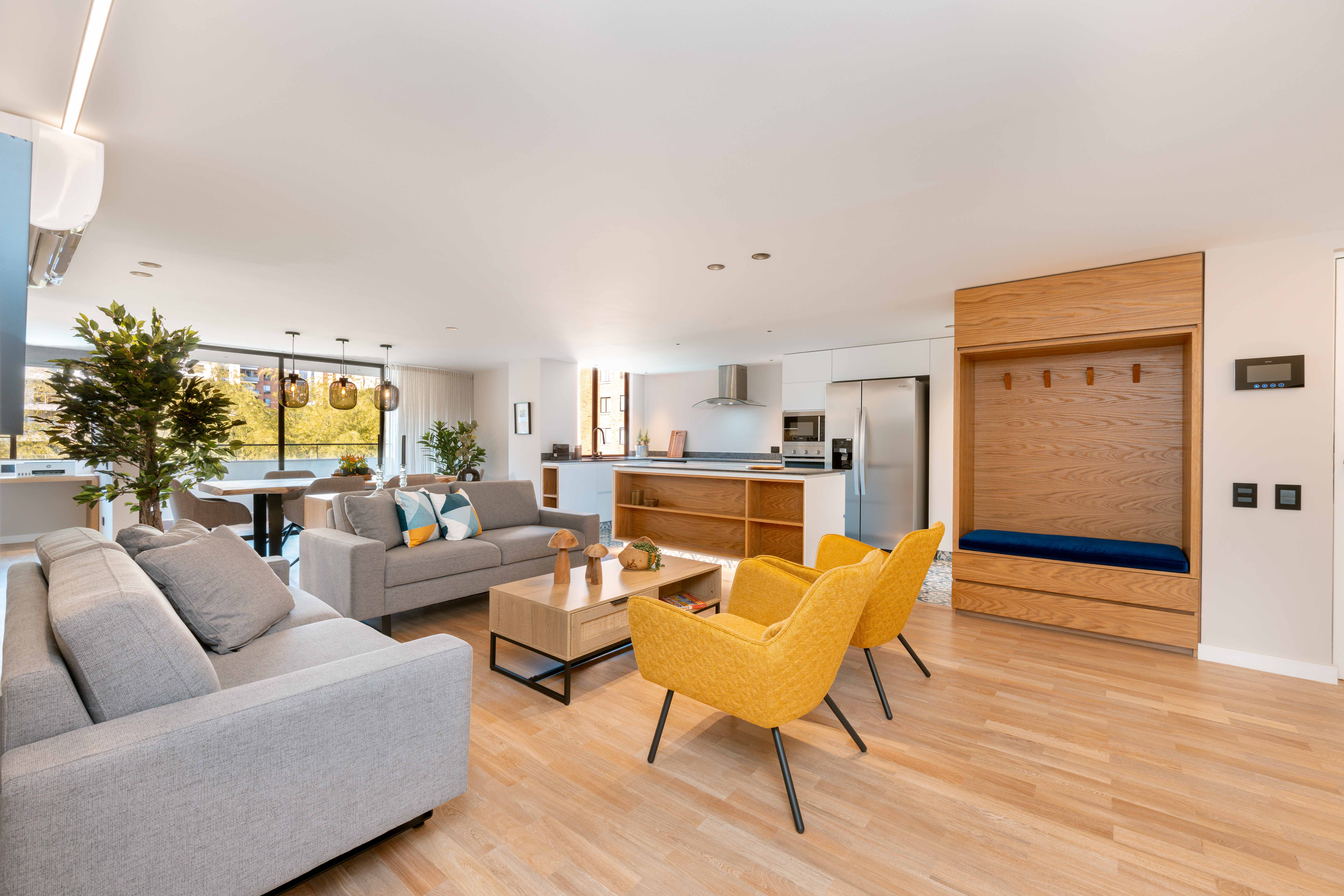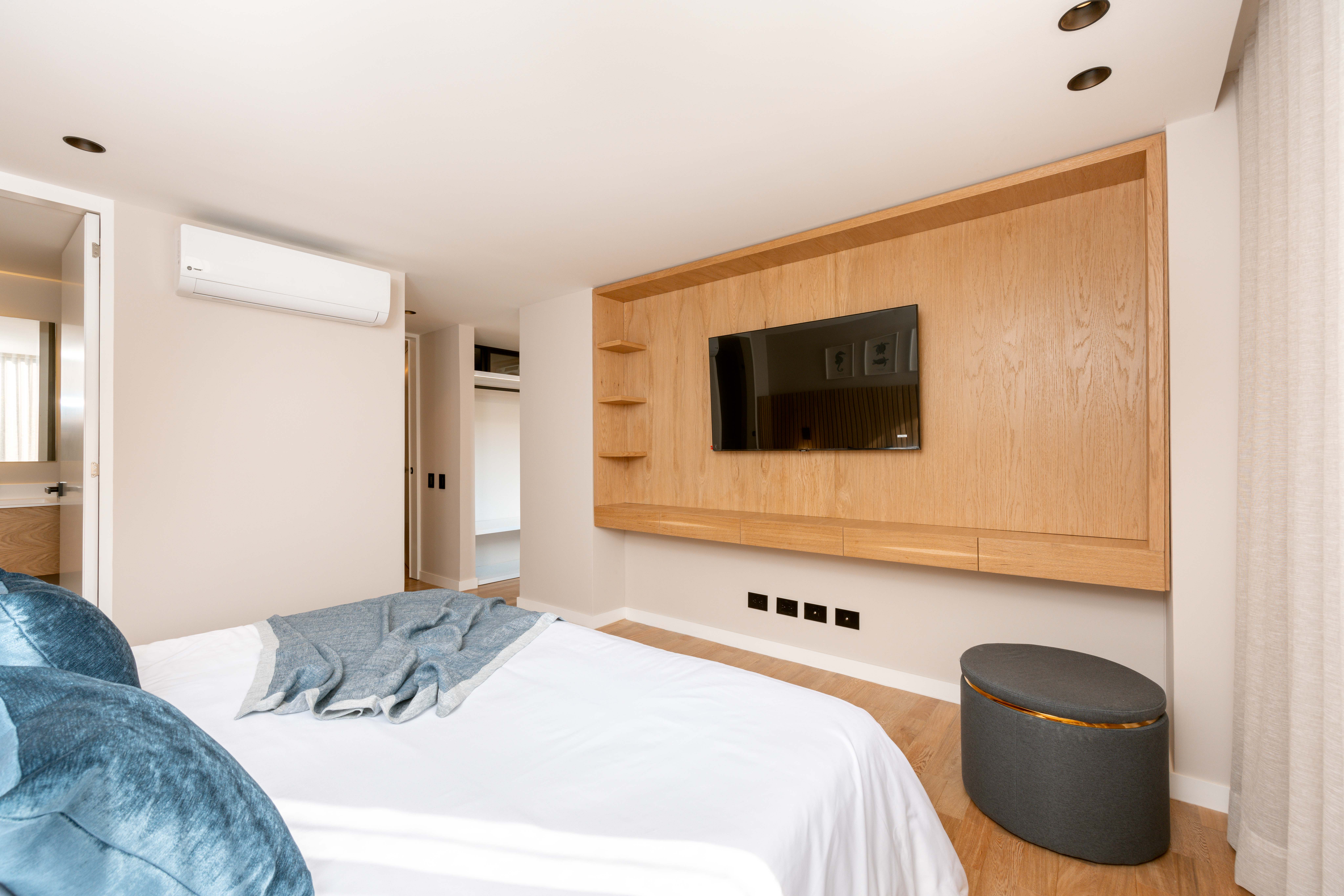 This brand-new and family-friendly 2-bedroom apartment features private bathrooms, closets, and AC in each room. The open living area includes a spacious living room, dining area, studio, and balcony with outdoor furniture perfect for relaxation. The fully equipped kitchen offers all essentials, including a dishwasher, while the laundry area has a washer, dryer, and custom cabinets.