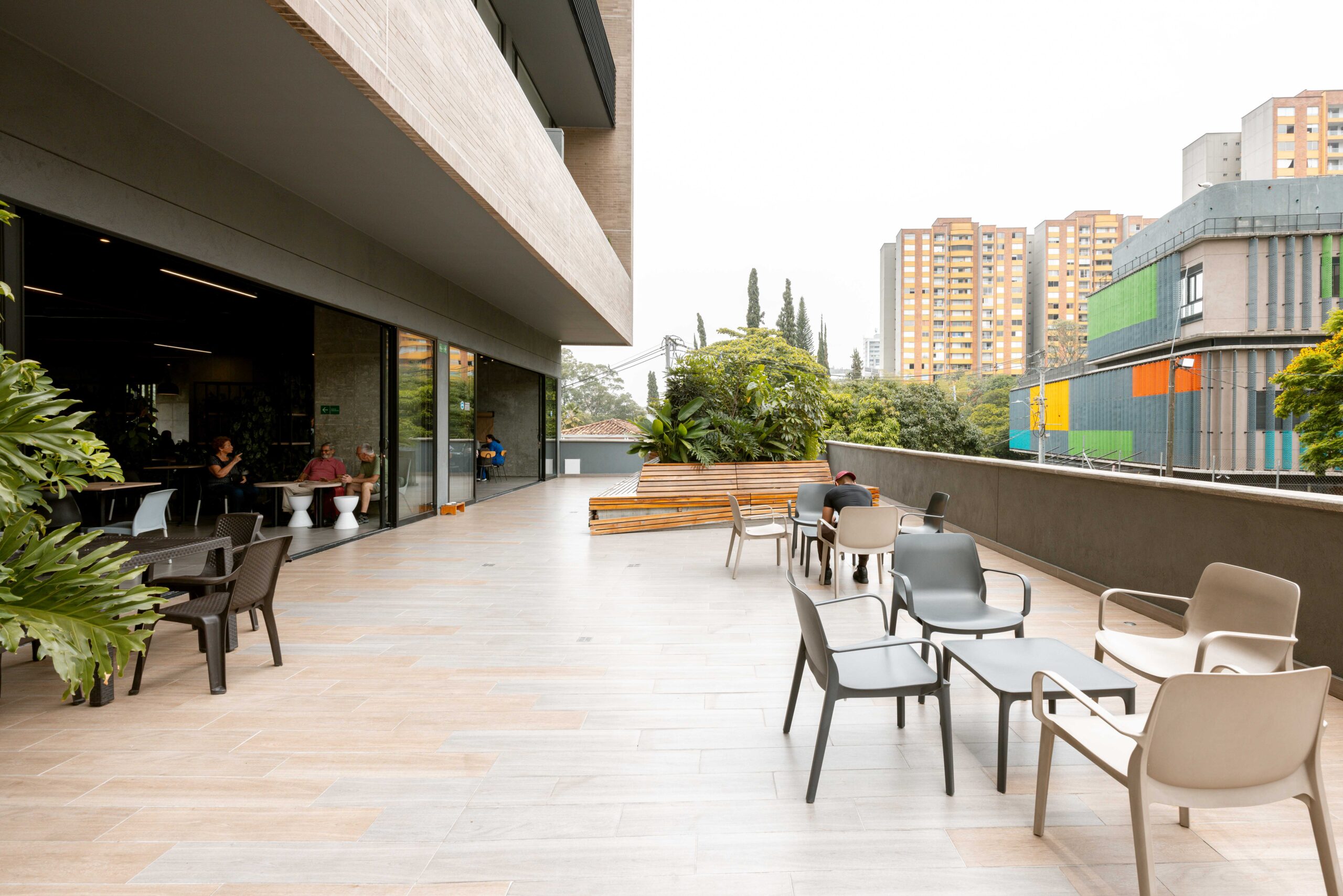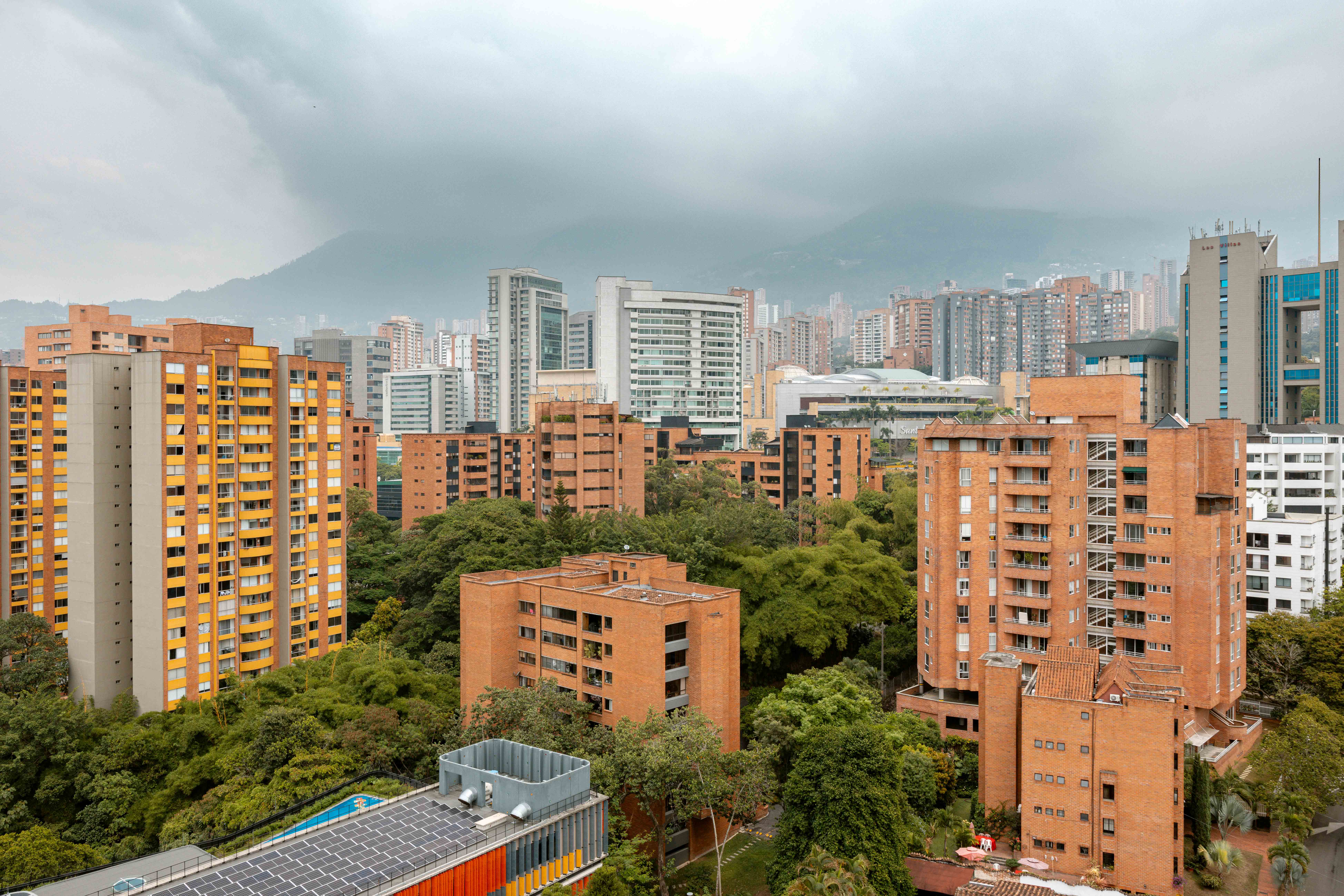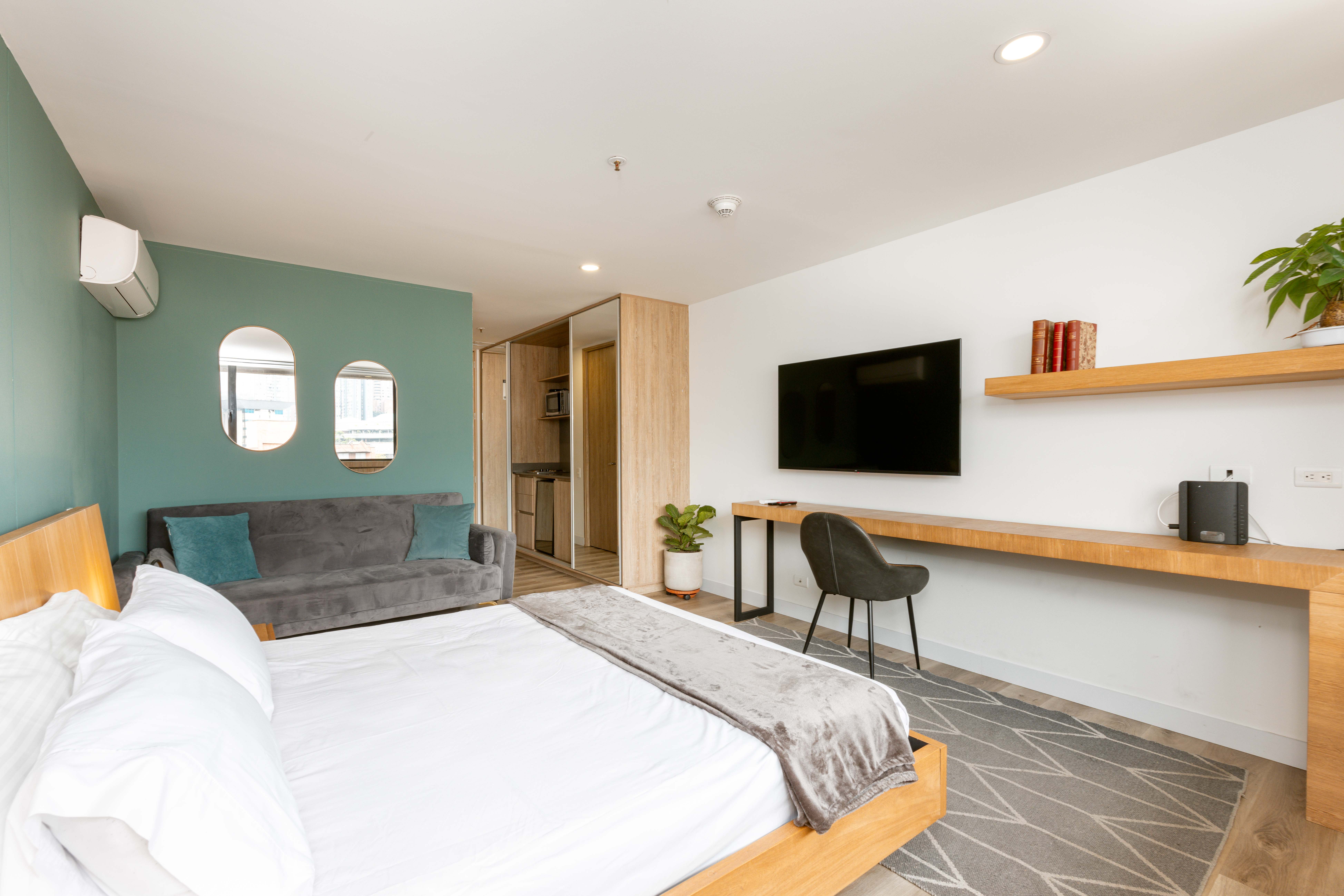 Centrally located loft in Medellin, 5 to 8 mins walking from the Golden Mile. New, serene building with nearby public transport. Features coworking space, cafe, and gym. Stunning views enhance the experience.