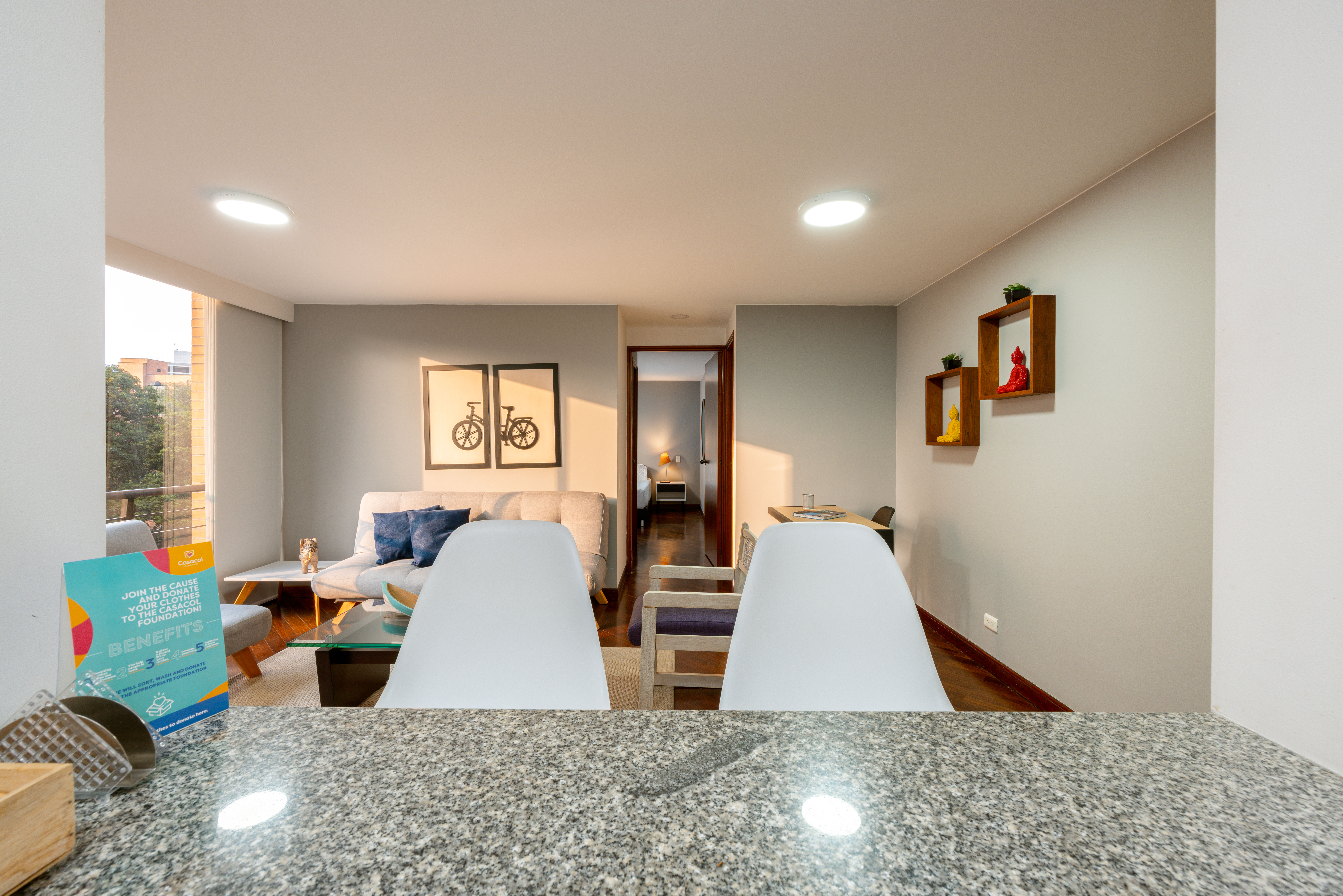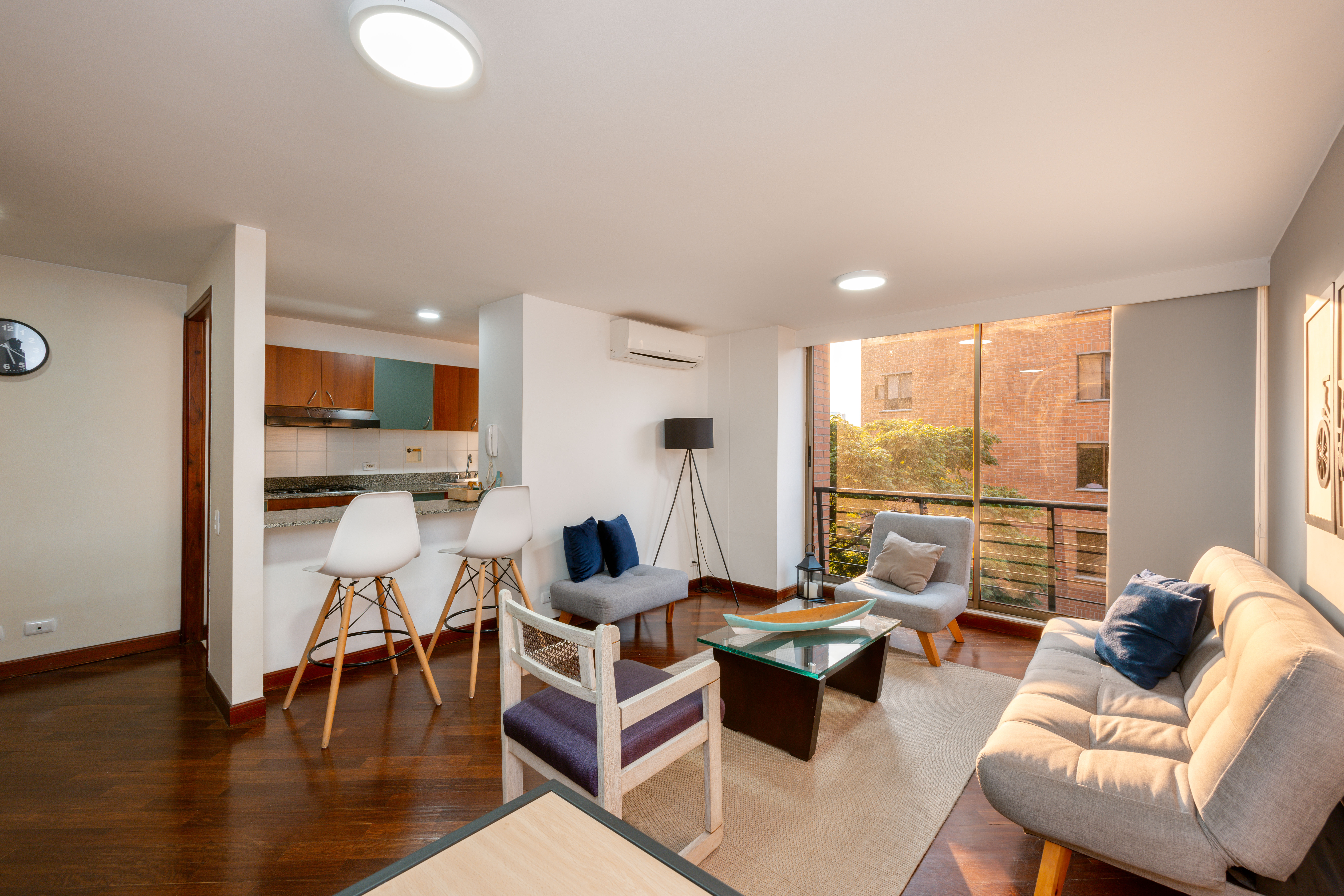 Furnished and spacious one-bedroom apartment located in Milla de Oro (The Golden Mile), Medellin’s financial/business and shopping district, walking distance to Santa Fe and Oviedo shopping mall, coffee shop, restaurants, gym. The apartment features a master bedroom with a private bathroom and walk-in closet. Also, a spacious living room with a sofa bed in case you are planning to have some guests with a personal working desk and AC. The kitchen is fully equipped, and also contains a washer.