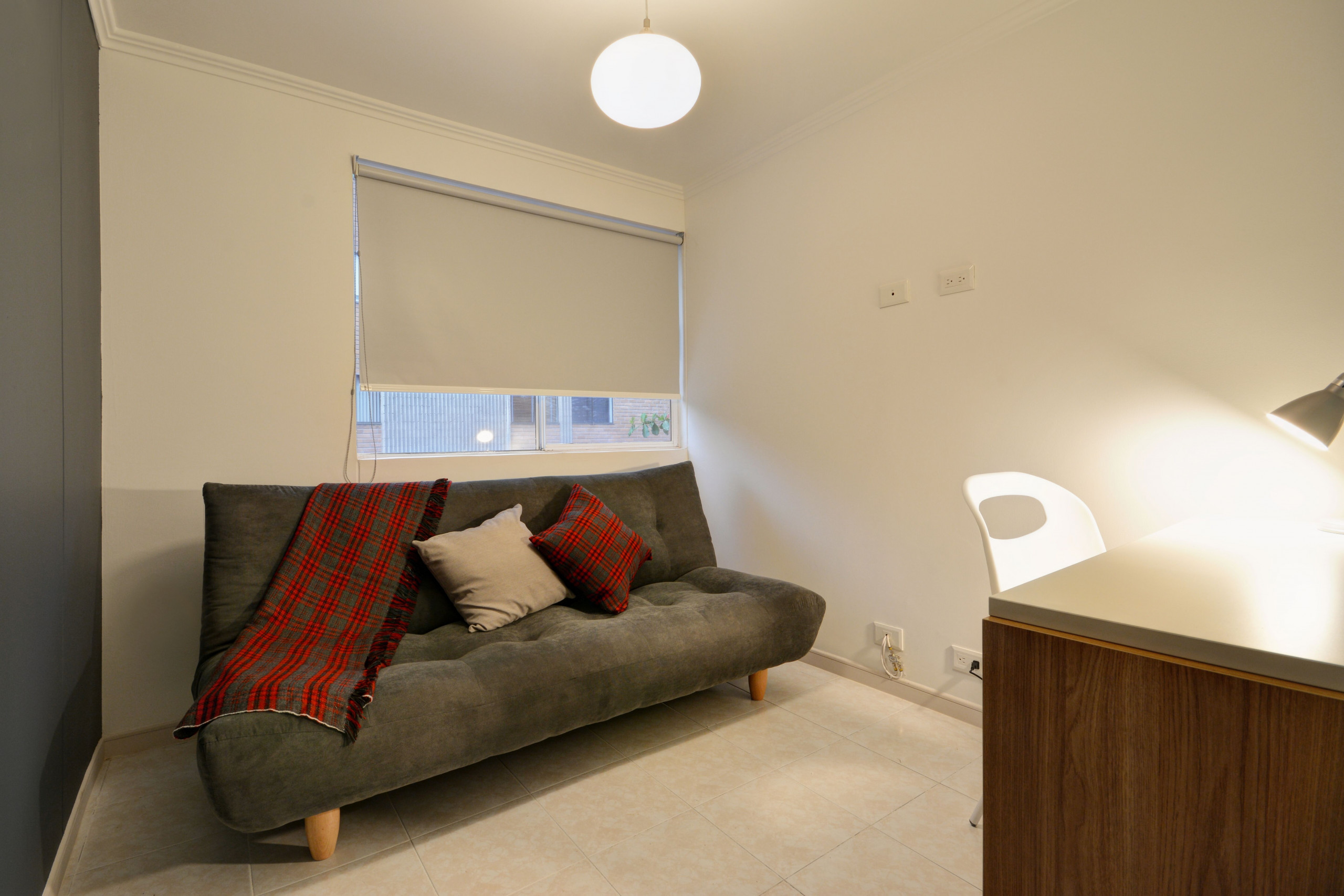 This apartment has two bedrooms and a space designated as an office, with a desk and a sofa bed.
